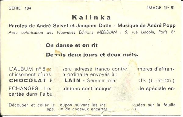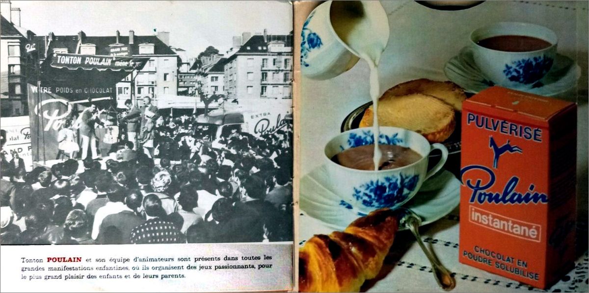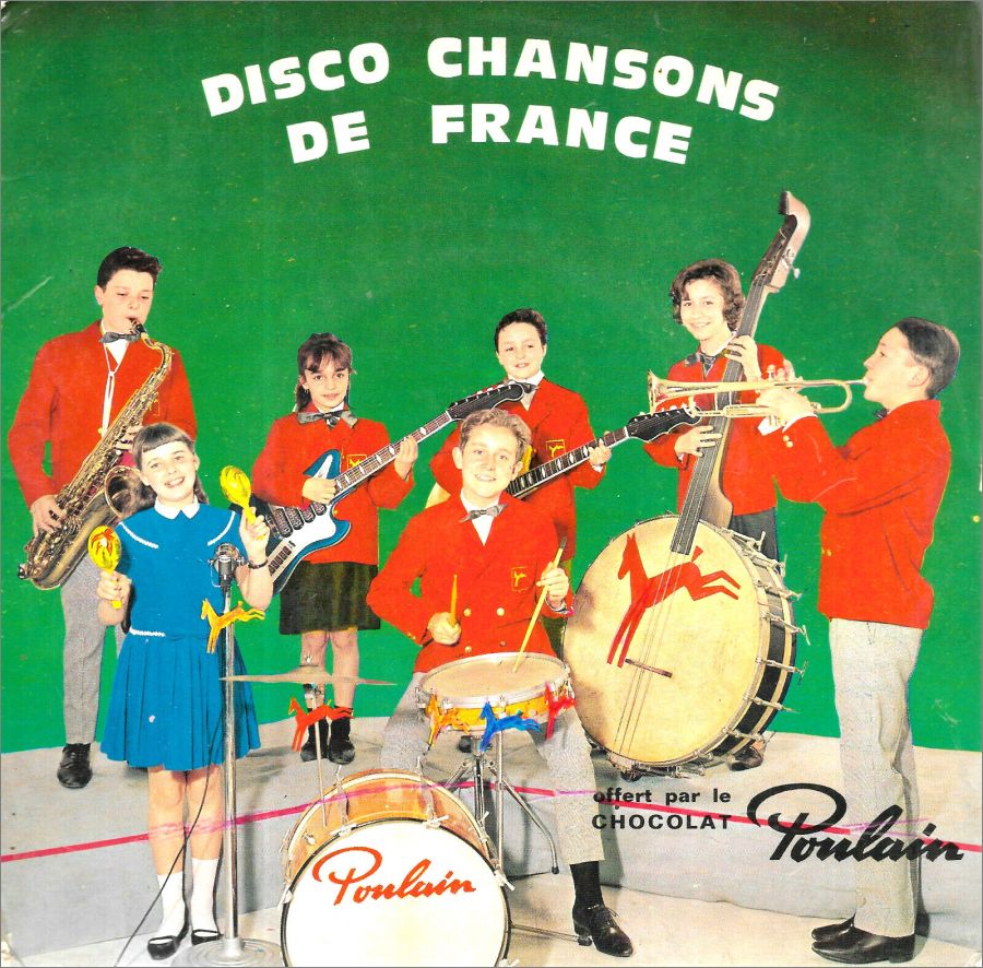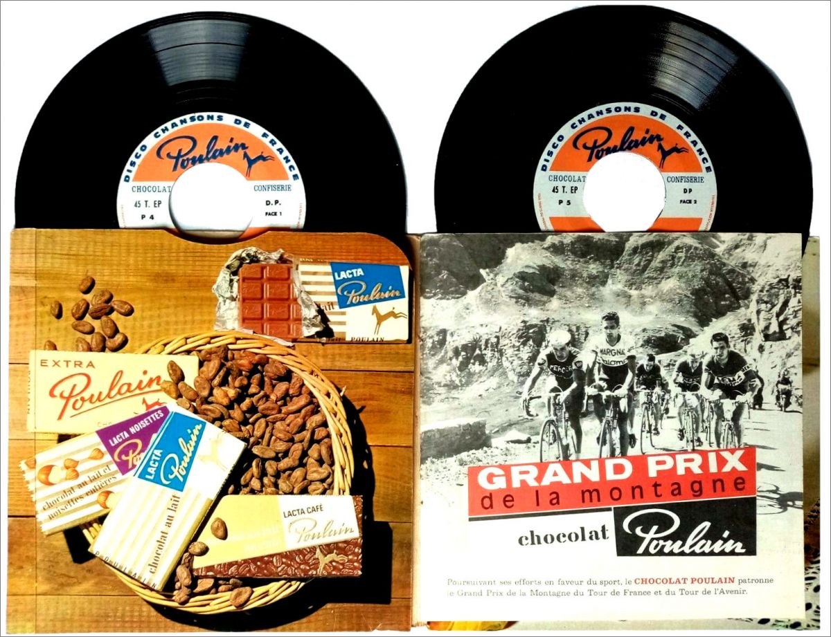 Avec cet album,il y avait offert par le chocolat POULAIN une pochette à double volet en carton (4 pages intérieures) comprenant 2 Vinyles microsillon super 45 tours (17cm), DISCO CHANSONS DE FRANCE. Sponsor du Grand Prix de la montagne, du Tour de France et du Tour de l'Avenir. Photo d'illustration de cyclistes des équipes Peugeot, Mercier et Yema.