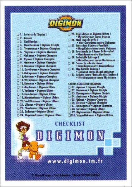 Bandai: 1 à 32, D1 à D10, B1 à B32, C = Checklist ( voir détail dans la fiche)