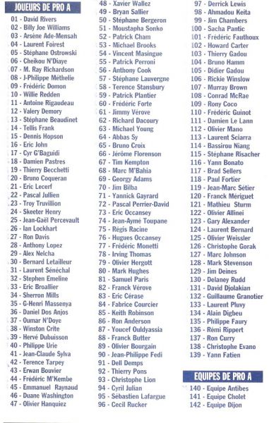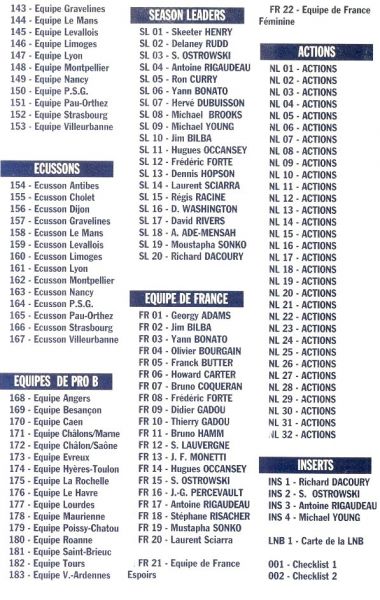 Panini : 1 à 183, SL1 à SL20, FR1 à FR22,NL1 à NL32, INS1 à INS4, LNB1, C1 à C2
