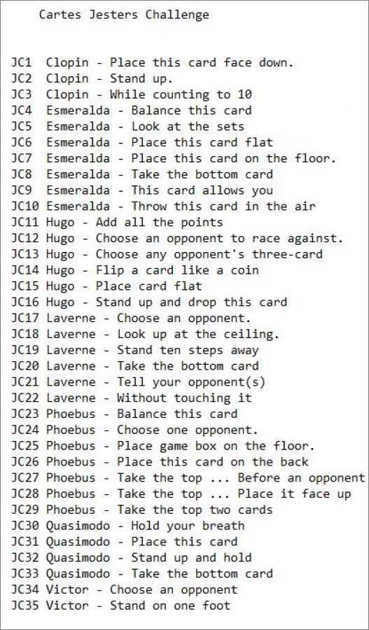 Cartes Jesters Challenge *Jest : JC1, JC2, JC3, JC4, JC5, JC6, JC7, JC8, JC9, JC10, JC11, JC12, JC13, JC14, JC15, JC16, JC17, JC18, JC19, JC20, JC21, JC22, JC23, JC24, JC25, JC26, JC27, JC28, JC29, JC30, JC31, JC32, JC33, JC34, JC35