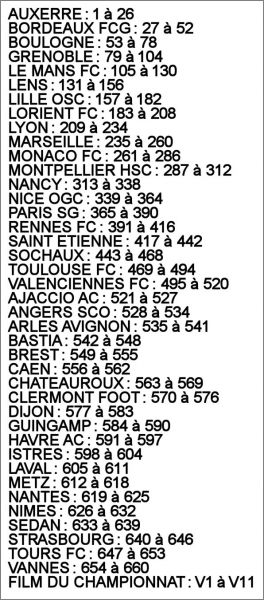 Sans oublier la carrière détaillée pour chaque joueur de Ligue 1, la présentation de tous les clubs (palmarès, statistiques, stades, maillots), les calendriers des matches de Ligue 1 et Ligue 2, ainsi que la rubrique « Spécial Transferts » grâce à laquelle tu pourras mettre à jour tous tes effectifs à l'issue du mercato hivernal (numérotées T1 à T25)