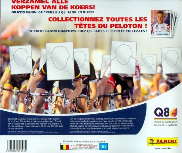Au dos on a mis : "En échange de ce sticker, vous recevrez 5 pochettes supplémentaires lorsque vous effectuerez un plein d'au moins 20 litres chez Q8." Infos, stickers supplémentaires et actions sur