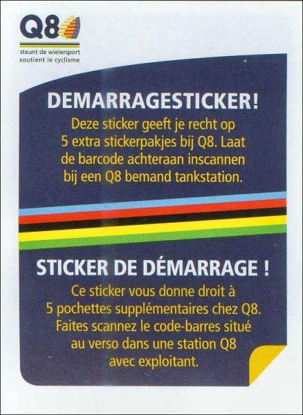 Ce sticker vous donne droit à 5 pochettes supplémentaires chez Q8. Faites scannez le code-barres situé au verso dans une station Q8 avec exploitant.