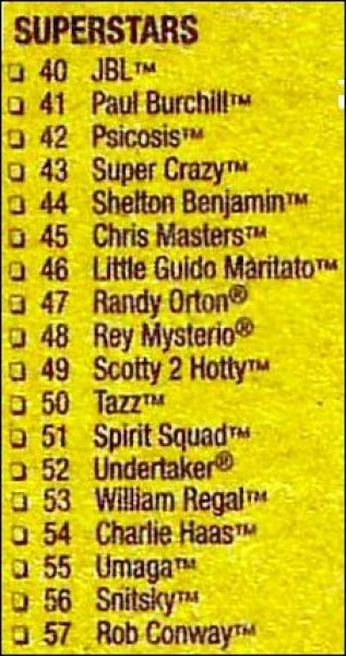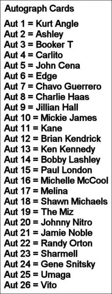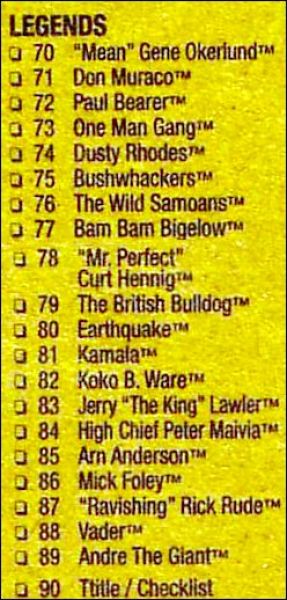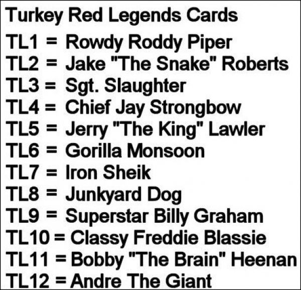 Communes = 1 à 90 Turkey Red Legends Cards = TL1 à TL12 Autograph Cards = Aut1 à Aut26 Ringside Relics = Rin1 à Rin8 Turkey Red Superstars = TS1 à TS12