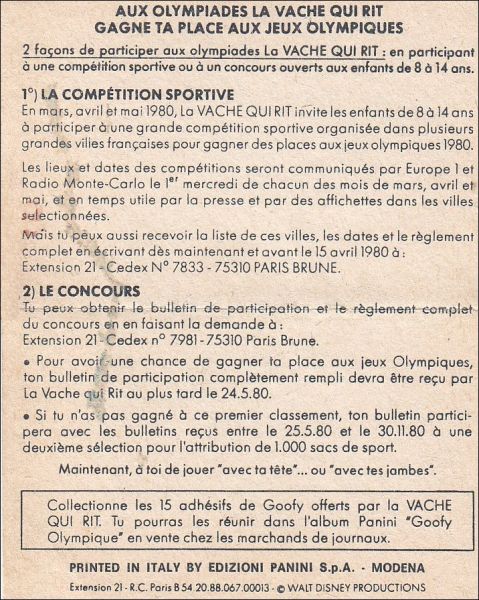 Goofy Olympique Sticker Album Figurine Panini - France 1980