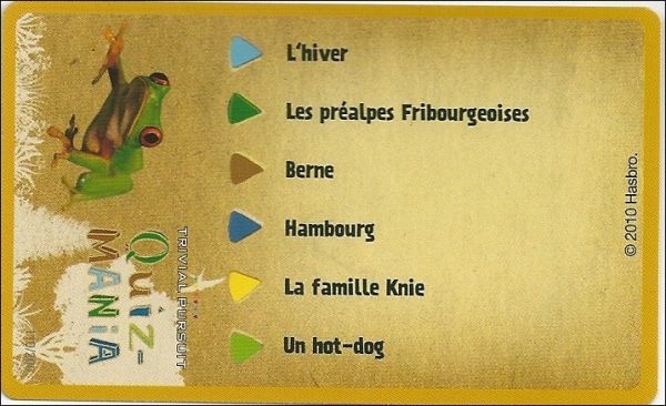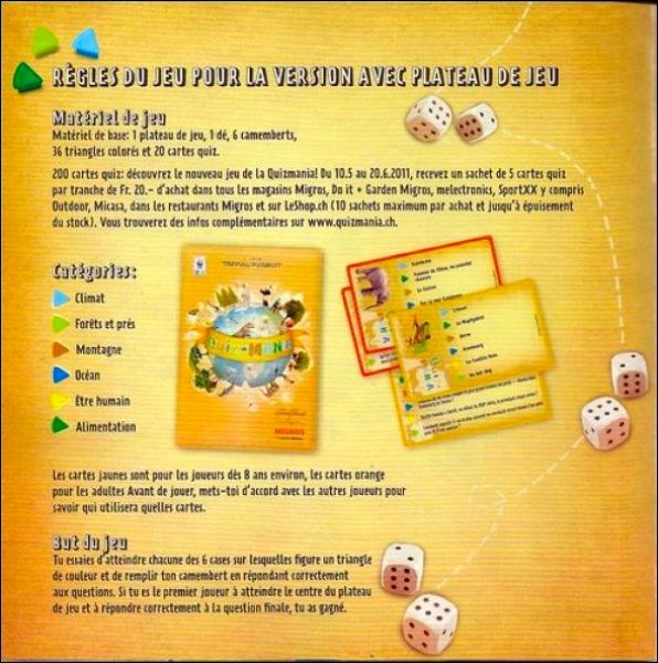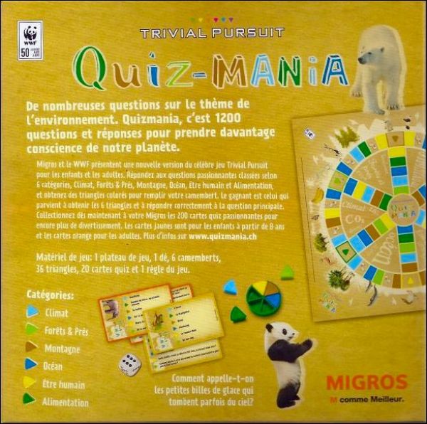 Quizmania est la version du jeu "Trivial Pursuit" élaborée par le WWF et la MIGROS qui te permets de découvrir le monde