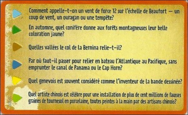 Pour ce faire, tu disposes de 200 cartes quizz contenant 1200 questions et réponses, de cartes joker, de joker devinette ainsi qu'une boîte de jeu comprenant un plateau de jeu, des camemberts et des triangles colorés (en vente à la Migros au prix de SFr. 9.80 et jusqu'à épuisement du stock)