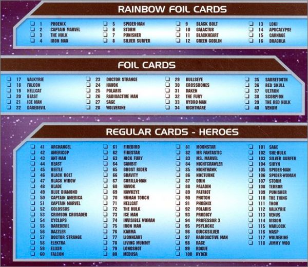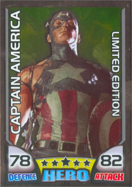 Topps: 1 à 200, T01 à T015 (Thor), CA01 à CA 015 (Captain America), LE1 à LE5 (Limited Edition), R (Règles du jeu)