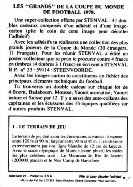 Stenval : 1 à 41 (Autocollants simples), D1 à D24 (D = Autocollants doubles:joueurs et pays), F1 à F41 (F = Fiches)