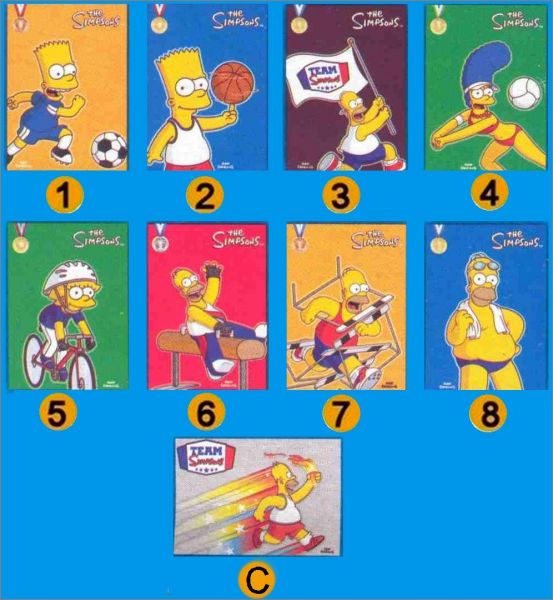 1: Bart Football 2: Bart Basket-Ball 3: Homer porte Drapeau 4: Marge Volley-Ball 5: Lisa Vélo 6: Homer Cheval d'Arçon 7: Homer Athlétisme 8: Homer Natation