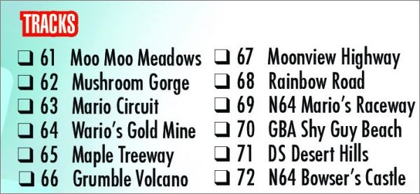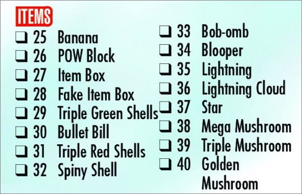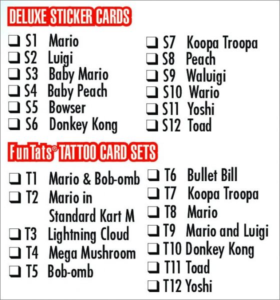 Enter- Play : 1 à 90, S1 à S12, T1 à T12, F1 à F24, F25 (Golden Mushroom exclusive)
