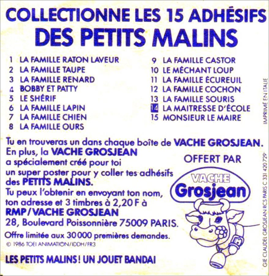 Les petits Malins - 15 Adhésifs - Vache Grosjean - 1986