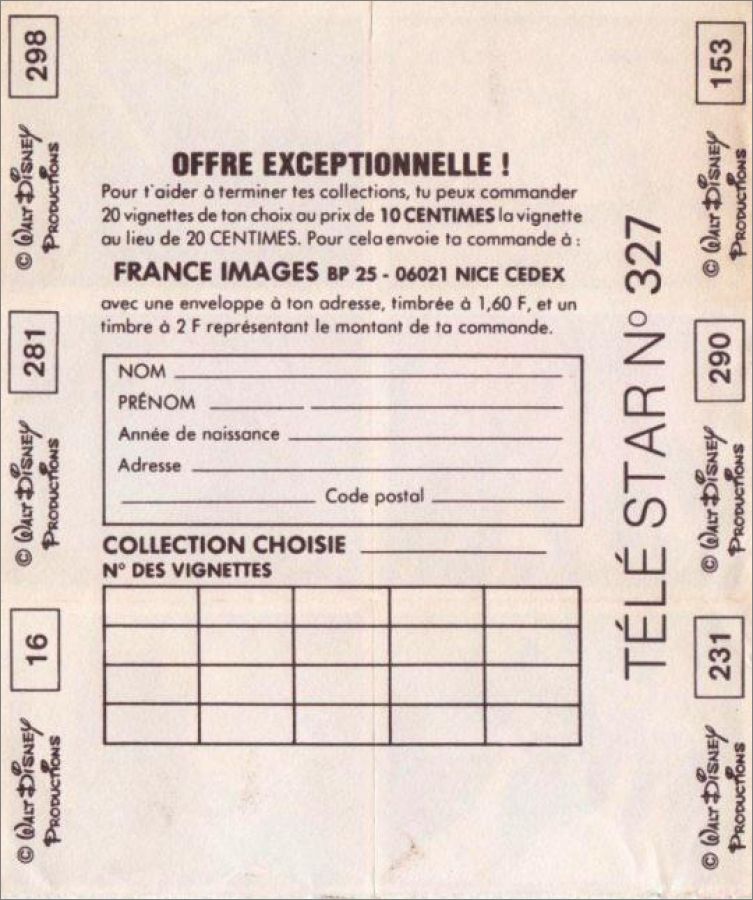 Il existe plusieurs planches de 6 images offertes dans le n°327 du magazine Télé Star: les images sont les mêmes que dans l'album mais le dos est imprimé "Télé Star" (voir scan).