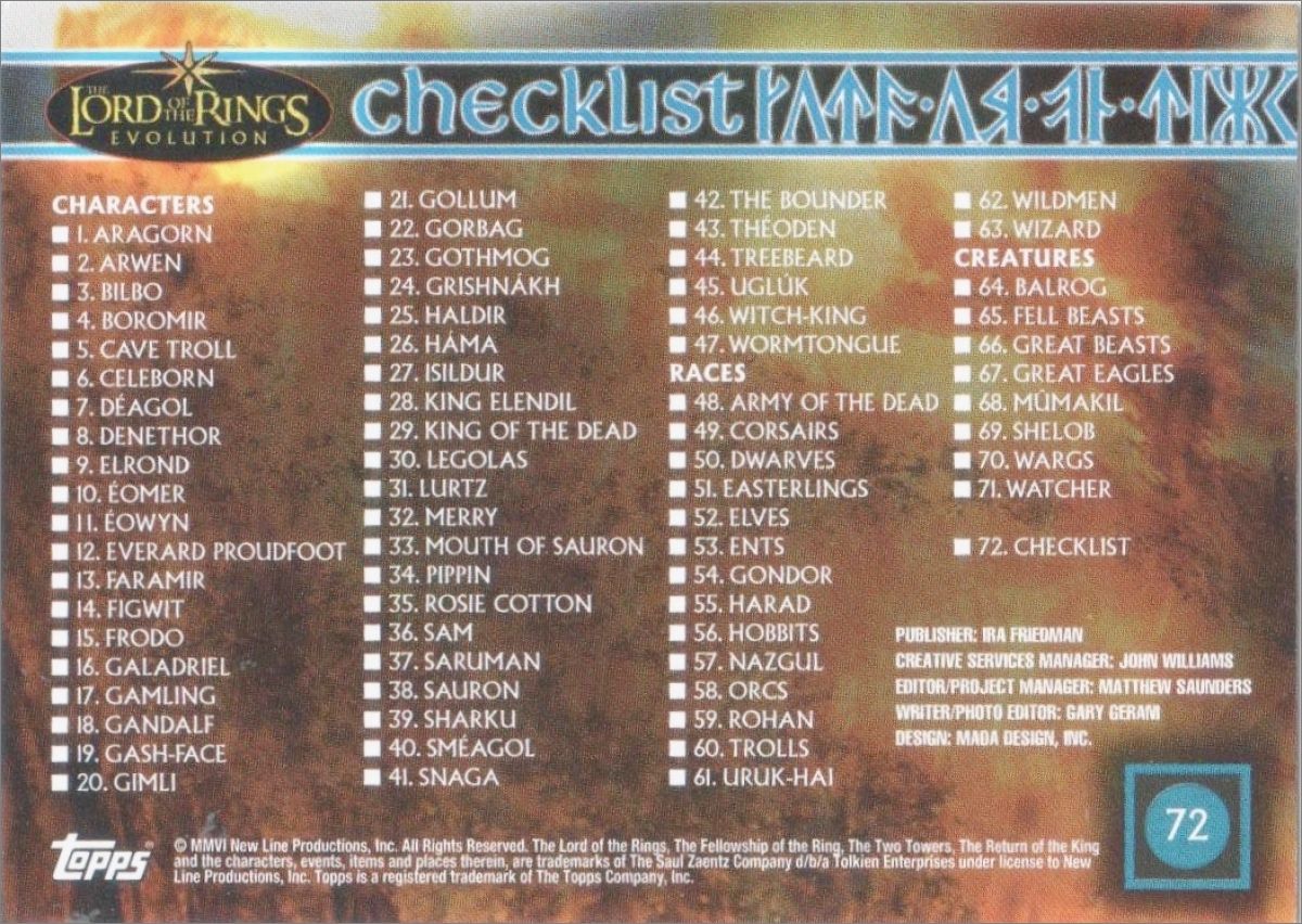 Topps: 1 à 72, P1, 1A à 20A, 1B à 12B, S1 à S10