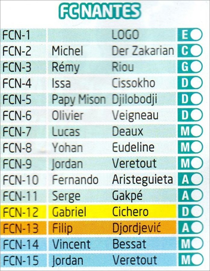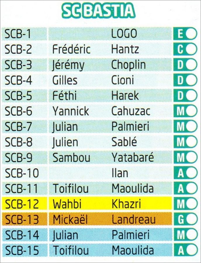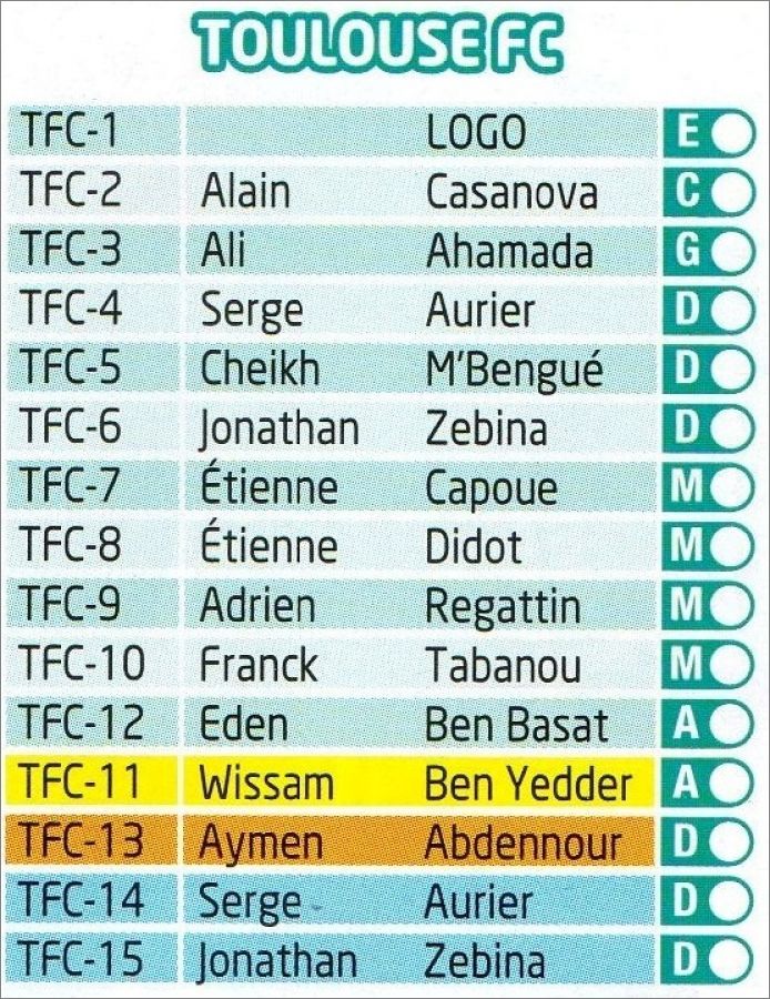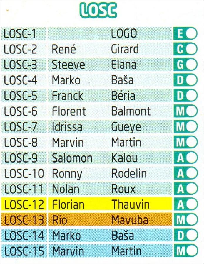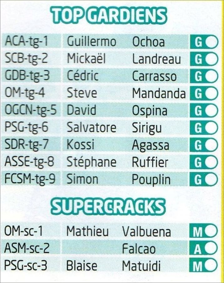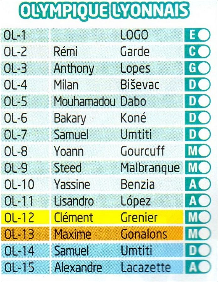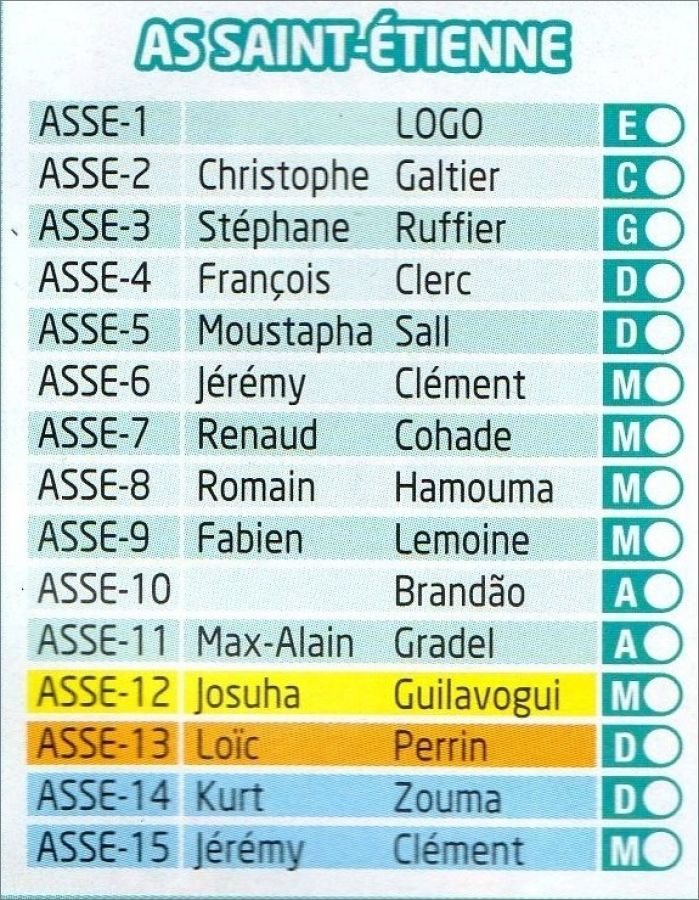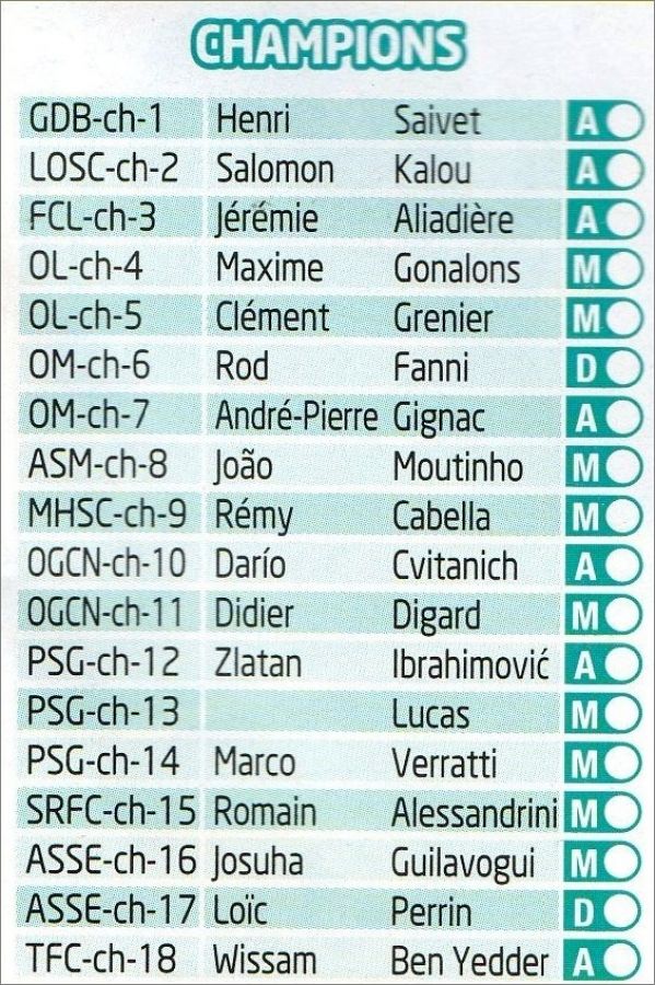 Panini : AJA1 à 15, BAS1 à 15, BOR1 à 15, EVI1 à 15, GUI1 à 15, LIL1 à 15, LOR1 à 15, LYO1 à 15, MAR1 à 15, MONA1 à 15, MONT1 à 15, NAN1 à 15, NIC1 à 15, PAR1 à 15, REI1 à 15, REN1 à 15, SAI1 à 15, SOC1 à 15, TOU1 à 15, VAL1 à 15, Ch1 à Ch18, TGa1 à TGa9, SCra1 à SCra3, CAV, GRE, LUC, VAL, AJA-up1, BAS (up1 à up2), BOR-up1, LIL (up1 à up2), LYO (up1 à up4), MAR (up1 à up4), MONA (up1 à up4), MONT (up1 à up2), NIC-up1, PAR (up1 à up2), REN-up1, SAI (up1 à up3), TOU-up1