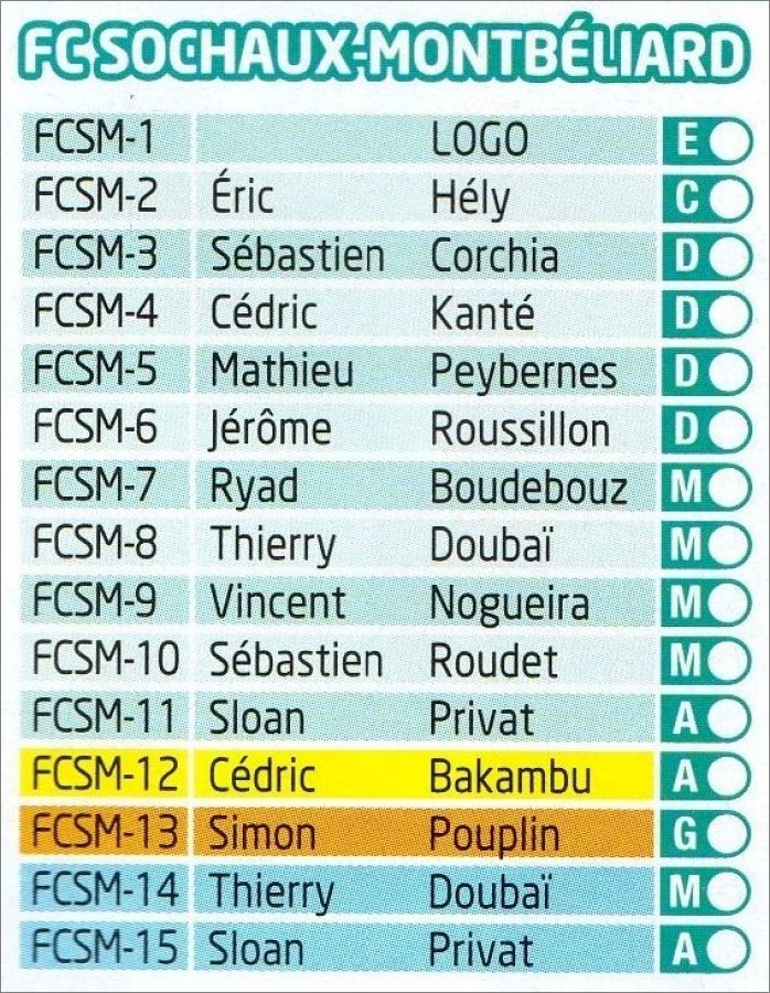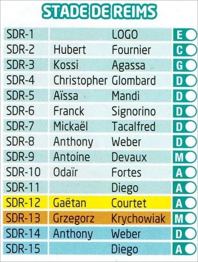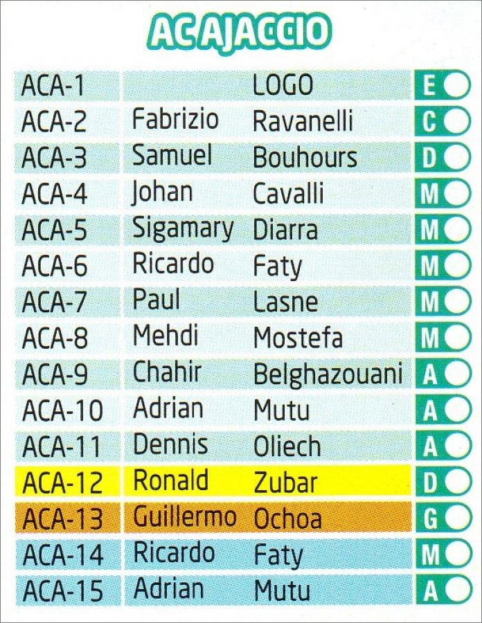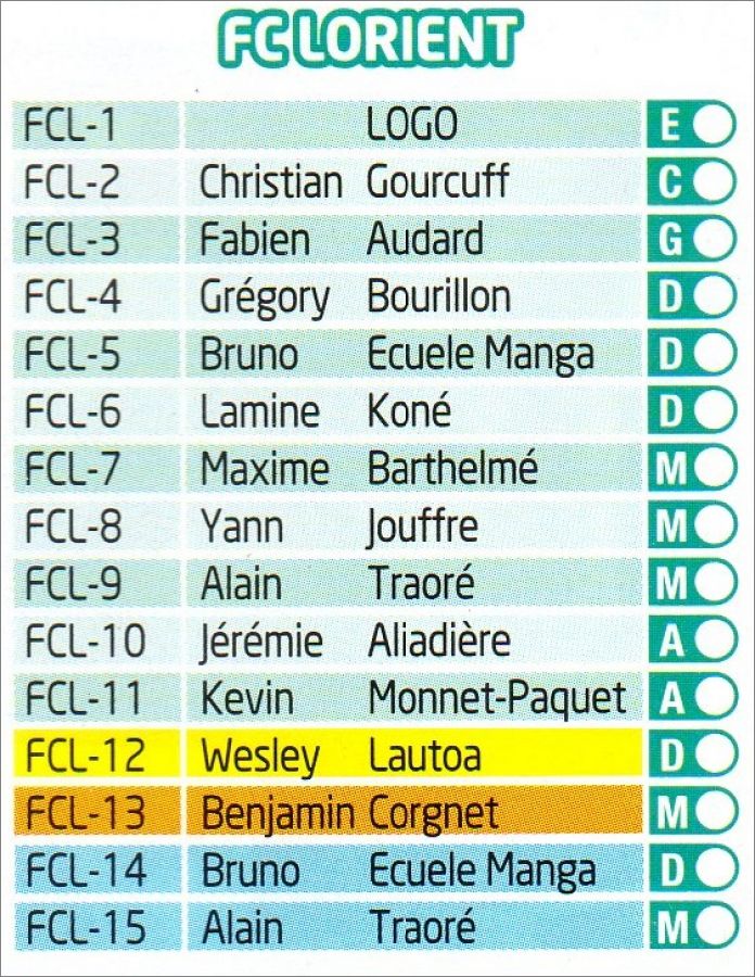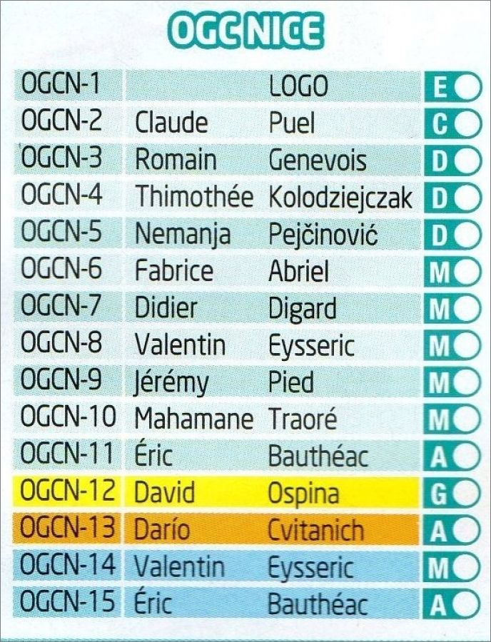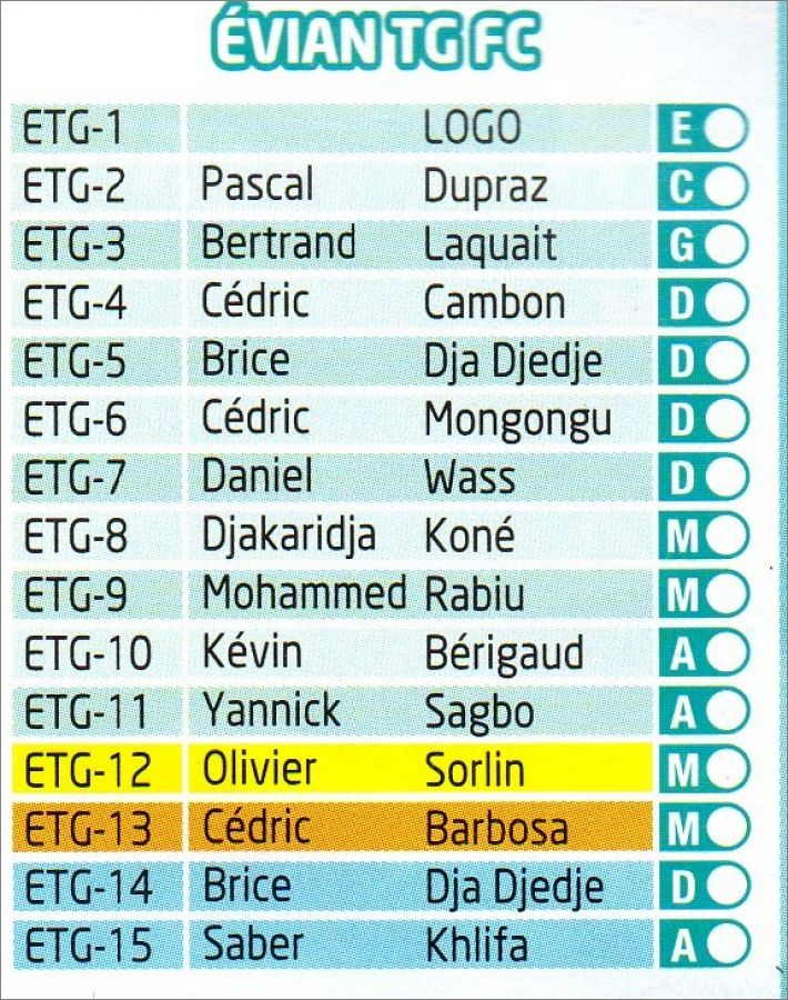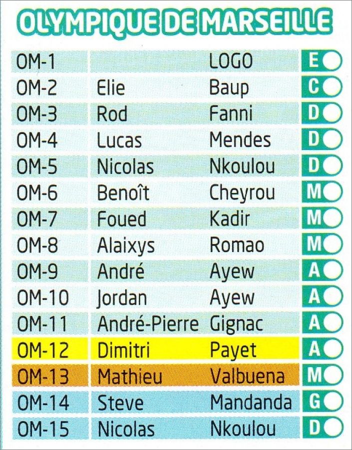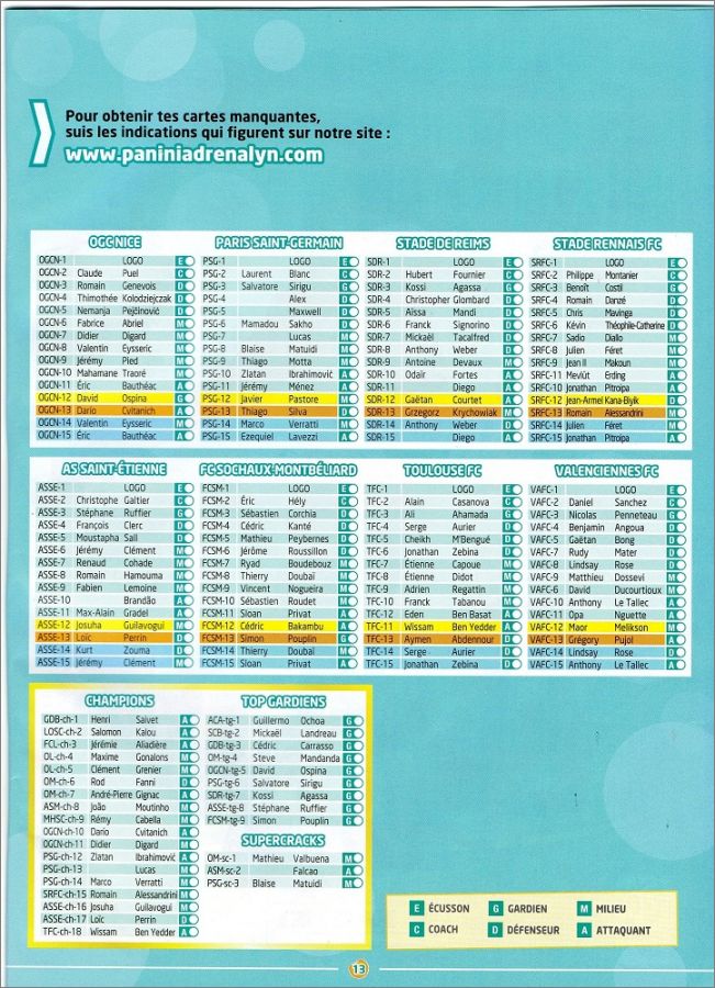 Panini : AJA1 à 15, BAS1 à 15, BOR1 à 15, EVI1 à 15, GUI1 à 15, LIL1 à 15, LOR1 à 15, LYO1 à 15, MAR1 à 15, MONA1 à 15, MONT1 à 15, NAN1 à 15, NIC1 à 15, PAR1 à 15, REI1 à 15, REN1 à 15, SAI1 à 15, SOC1 à 15, TOU1 à 15, VAL1 à 15, Ch1 à Ch18, TGa1 à TGa9, SCra1 à SCra3, CAV, GRE, LUC, VAL, AJA-up1, BAS (up1 à up2), BOR-up1, LIL (up1 à up2), LYO (up1 à up4), MAR (up1 à up4), MONA (up1 à up4), MONT (up1 à up2), NIC-up1, PAR (up1 à up2), REN-up1, SAI (up1 à up3), TOU-up1
