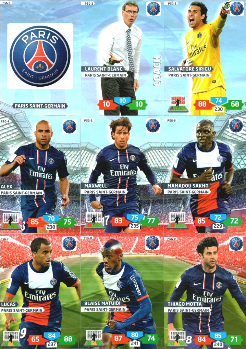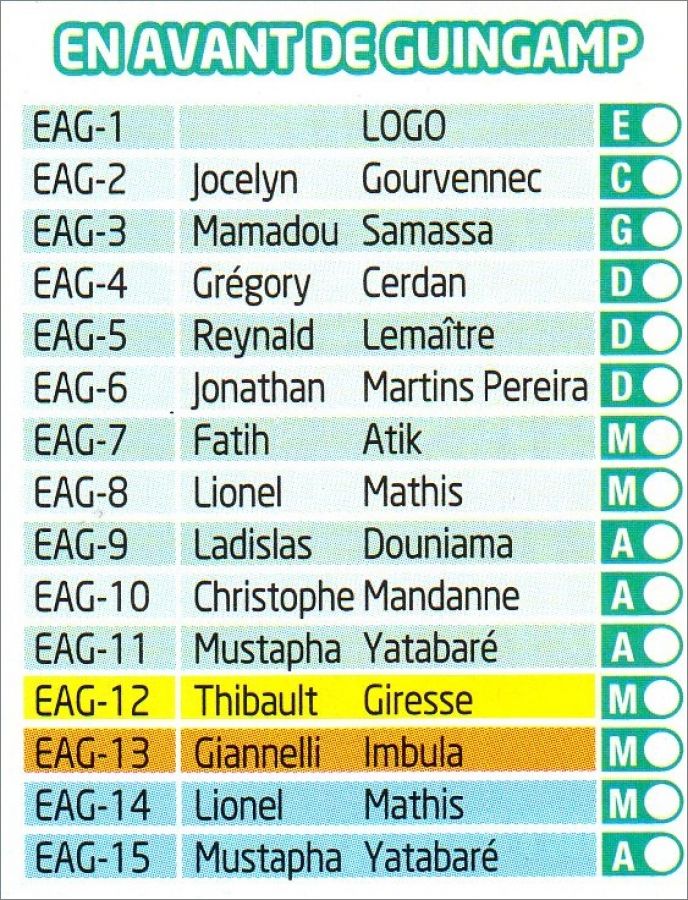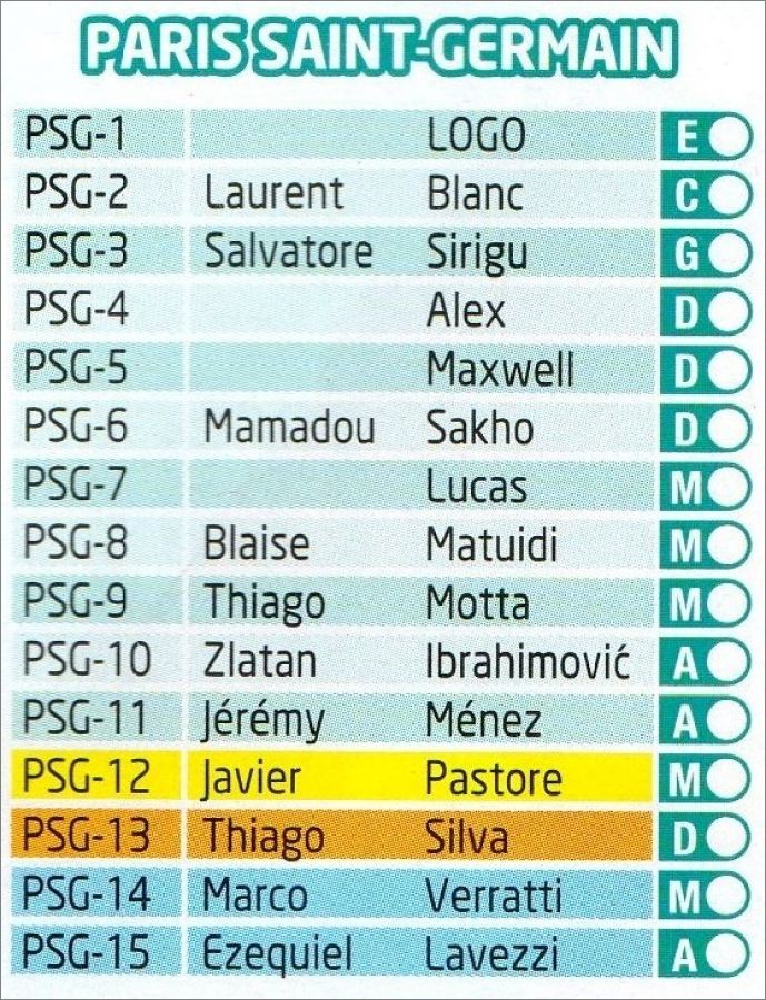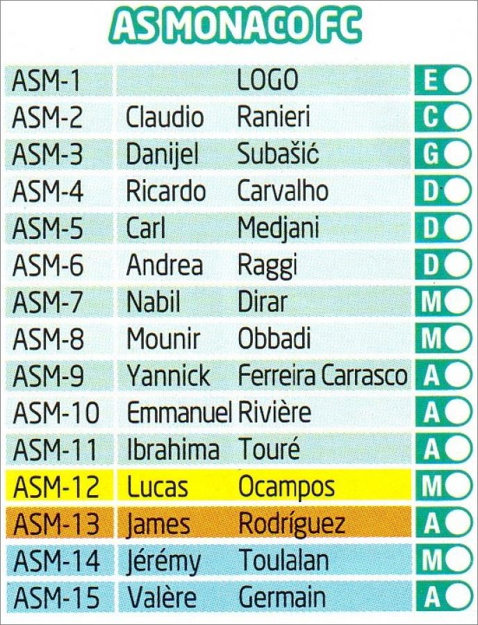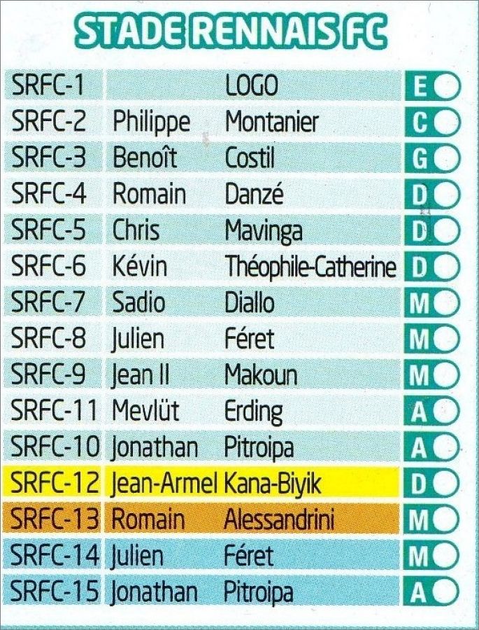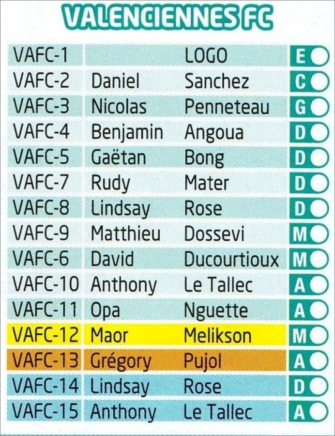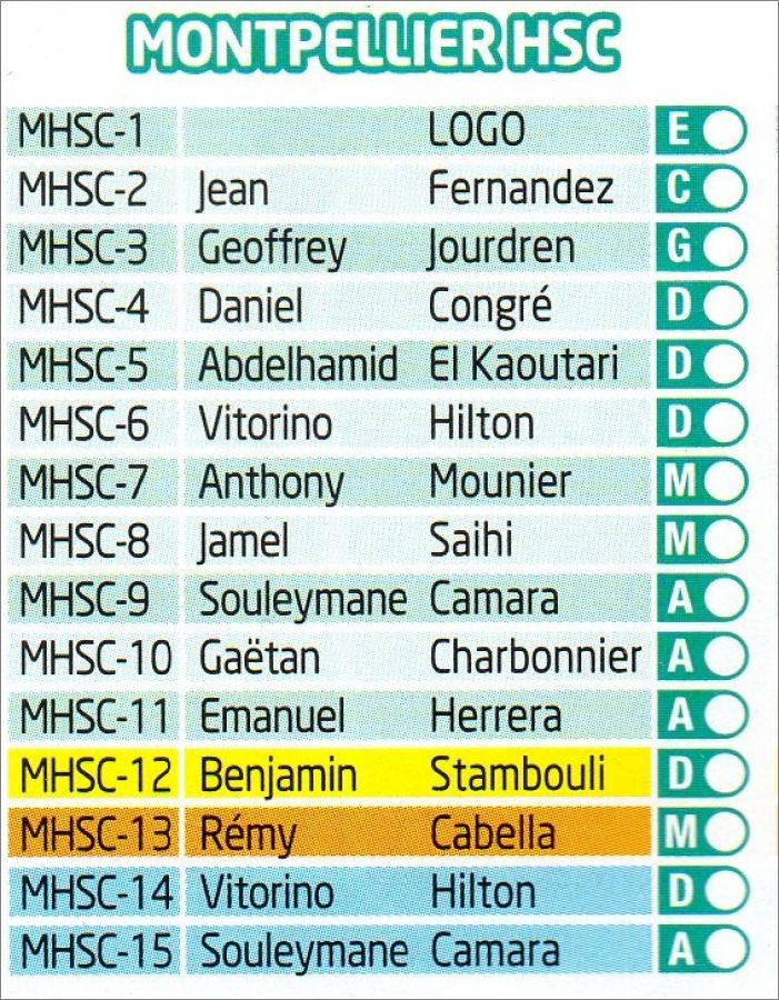 Panini : AJA1 à 15, BAS1 à 15, BOR1 à 15, EVI1 à 15, GUI1 à 15, LIL1 à 15, LOR1 à 15, LYO1 à 15, MAR1 à 15, MONA1 à 15, MONT1 à 15, NAN1 à 15, NIC1 à 15, PAR1 à 15, REI1 à 15, REN1 à 15, SAI1 à 15, SOC1 à 15, TOU1 à 15, VAL1 à 15, Ch1 à Ch18, TGa1 à TGa9, SCra1 à SCra3, CAV, GRE, LUC, VAL, AJA-up1, BAS (up1 à up2), BOR-up1, LIL (up1 à up2), LYO (up1 à up4), MAR (up1 à up4), MONA (up1 à up4), MONT (up1 à up2), NIC-up1, PAR (up1 à up2), REN-up1, SAI (up1 à up3), TOU-up1