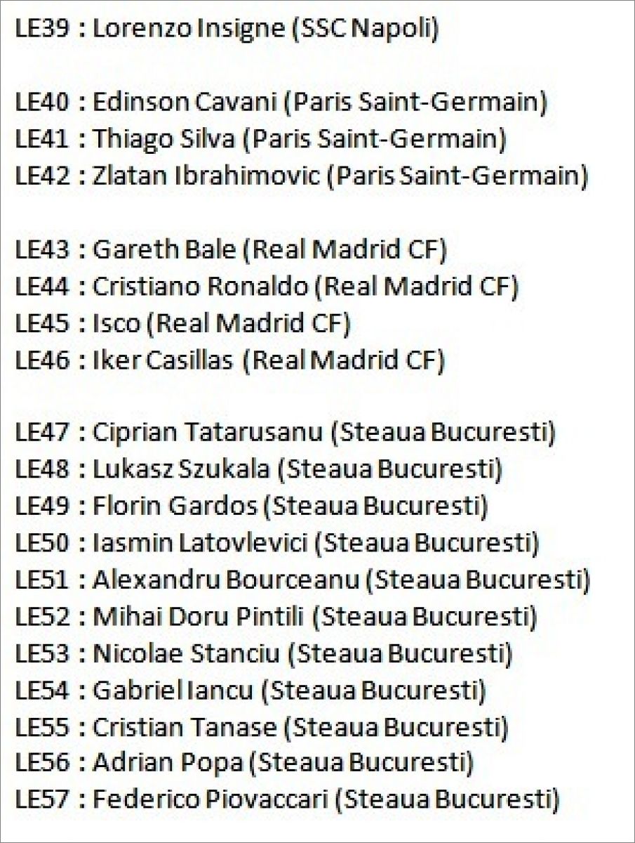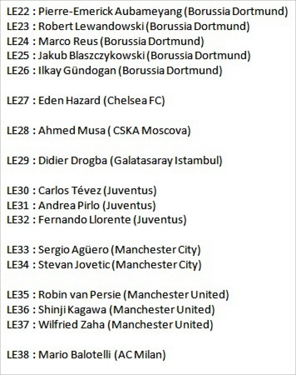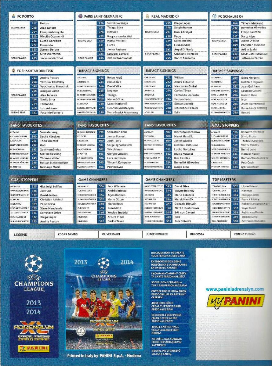 Panini : 1 à 380, LE1 à LE57 (Limited Editions), LX1 à LX10 (Limited XXL), GG1 à GG4 (German Glories)
