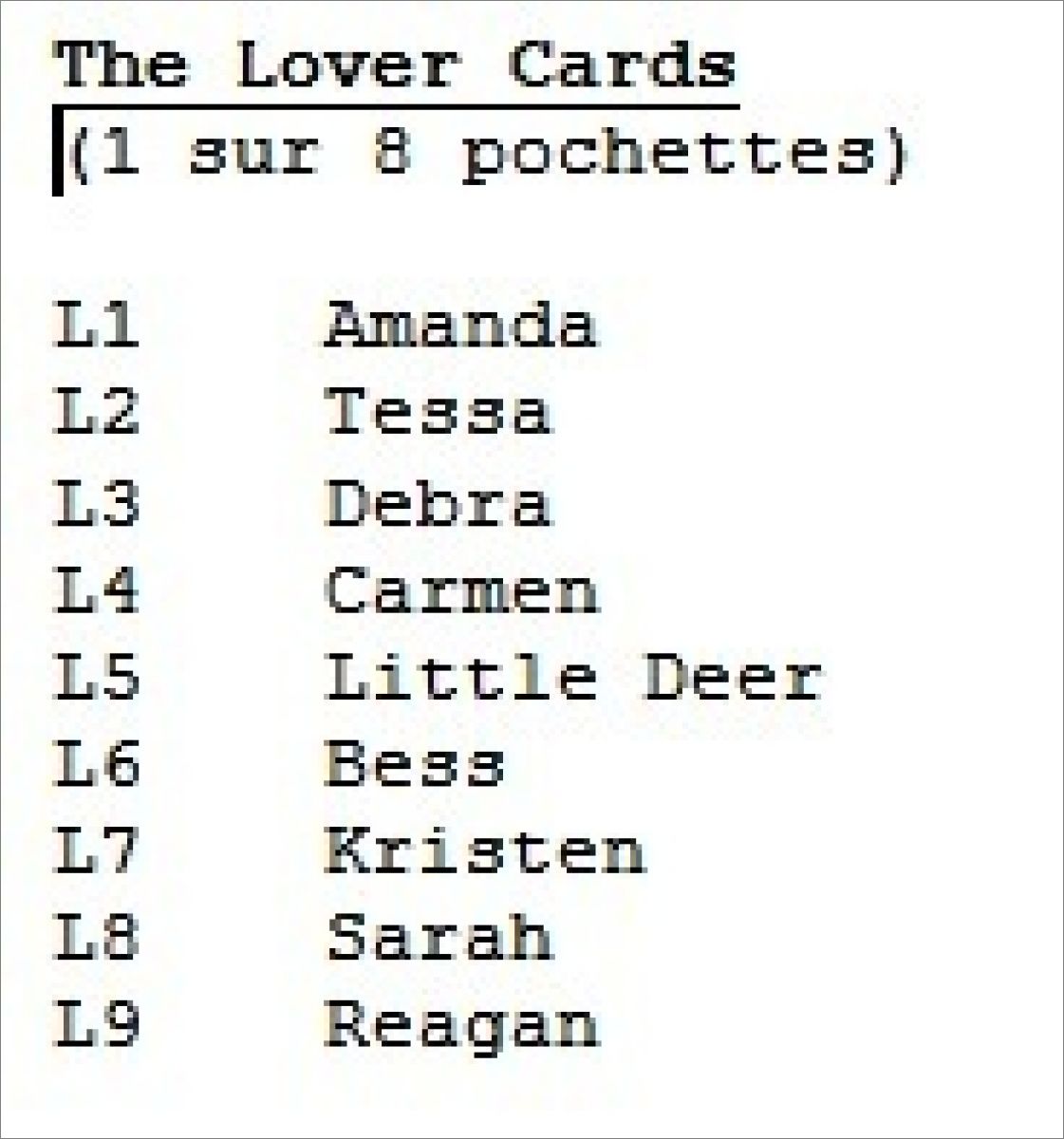 The Lover Cards (1 sur 8 pochettes) *lov : L1, L2, L3, L4, L5, L6, L7, L8, L9
