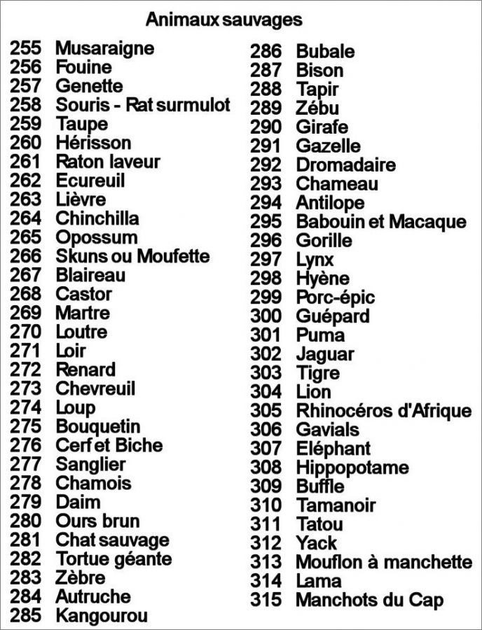 Liste des Animaux sauvages