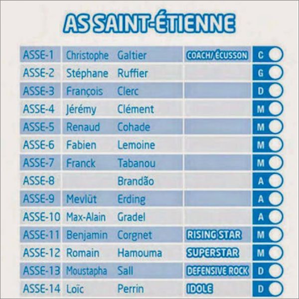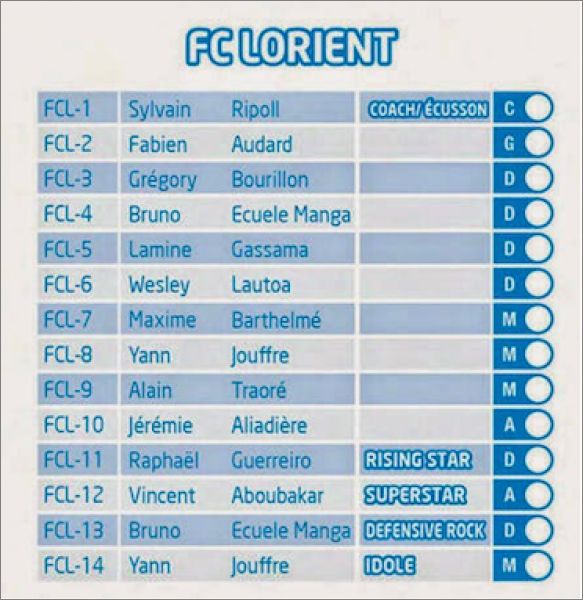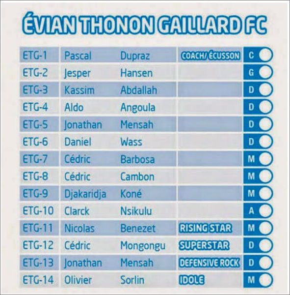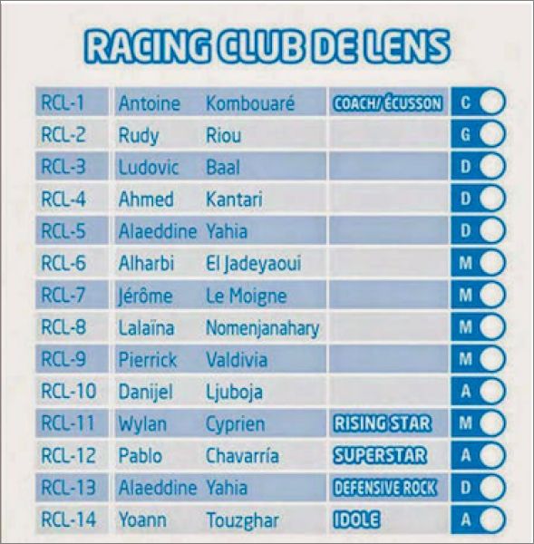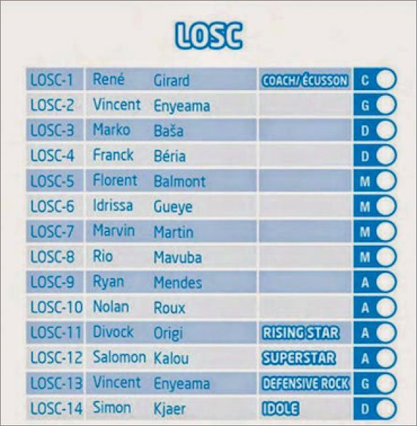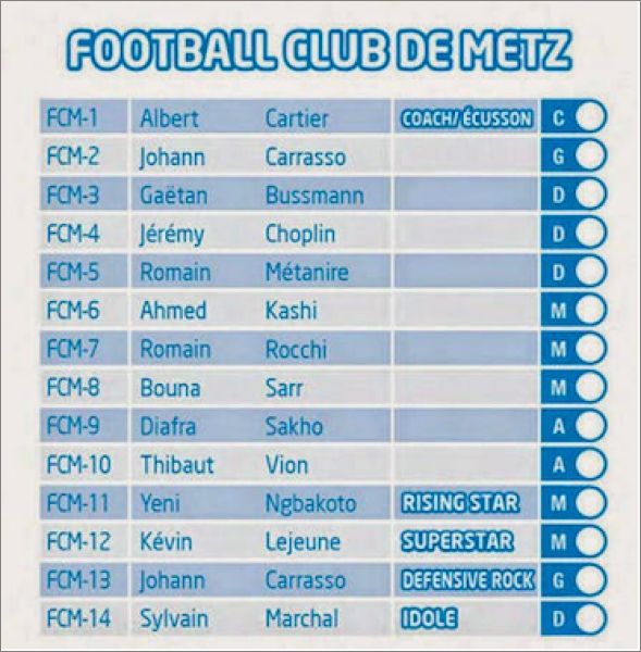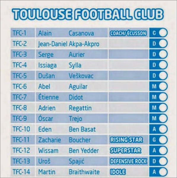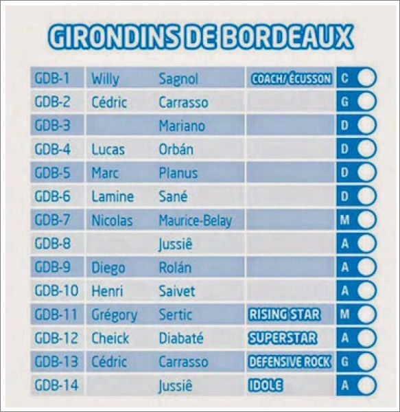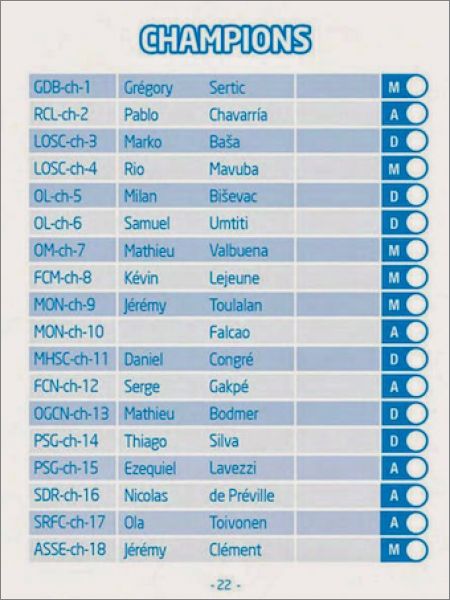Panini : Asse1 à 14, Eag1 à 14, Etg1 à 14, Fcl1 à 14, Fcm1 à 14, Fcn1 à 14, Gdb1 à 14, Losc1 à 14, Mhsc1 à 14, Mon1 à 14, Ogcn1 à 14, Ol1 à 14,Om1 à 14, Psg1 à 14, Rcl1 à 14, Scb1 à 14, Sdr1 à 14, Smc1 à 14, Srfc1 à 14, Tfc1 à 14, Ch1 à Ch18, SCra1 et SCra2, IBR, FAL, KAL, MOU, LAC, LUI, AYE, VER, ASSE-UP1, ASSE-UP2, ASSE-UP3, EAG-UP1, ETG-UP1, ETG-UP2, FCL-UP1, . FCL-UP2, FCL-UP3, FCL-UP4, FCM-UP1, FCM-UP2, FCN-UP1, FCN-UP2, GDB-UP1, GDB-UP2, GDB-UP3, LOSC-UP1, LOSC-UP2, MHSC-UP1, MHSC-UP2, MHSC-UP3, MON-UP1, MON-UP2, MON-UP3, OGCN-UP1, OGCN-UP2, OGCN-UP3, OL-UP1, OL-UP2, OL-UP3, OM-UP1, OM-UP2, OM-UP3, PSG-UP1, PSG-UP2, PSG-UP3, RCL-UP1, SCB-UP1, SCB-UP2, SCB-UP3, SDR-UP1, SDR-UP2, SDR-UP3, SMC-UP1, SMC-UP2, SFRC-UP1, SFRC-UP2, SFRC-UP3, TFC-UP1, TFC-UP2, TFC-UP3, OM-CH-UP1, MON-CH-UP2