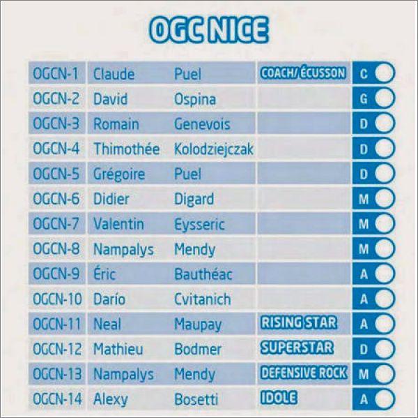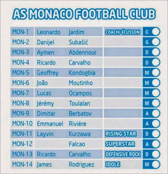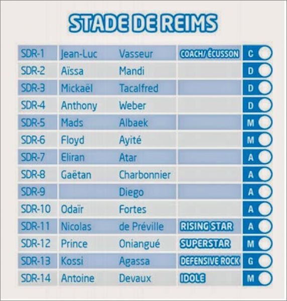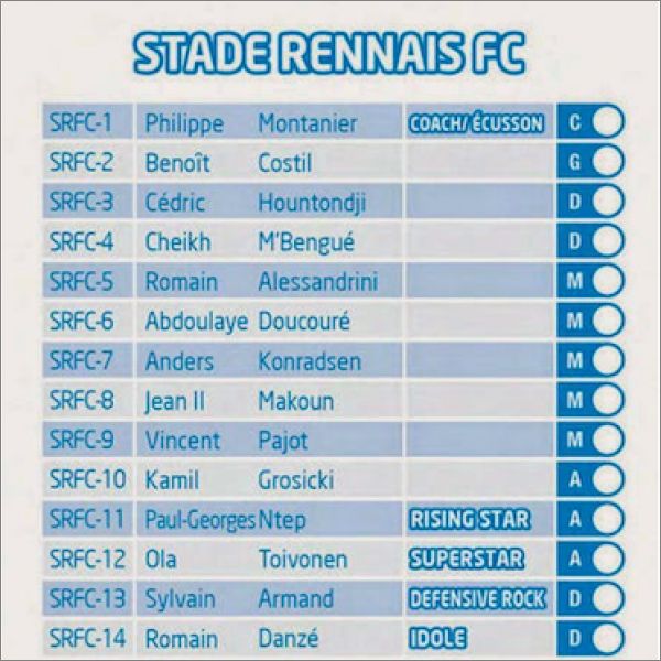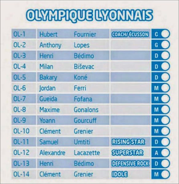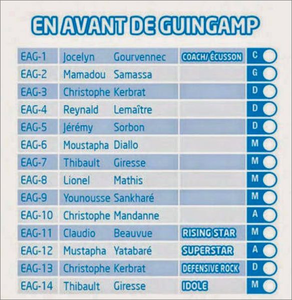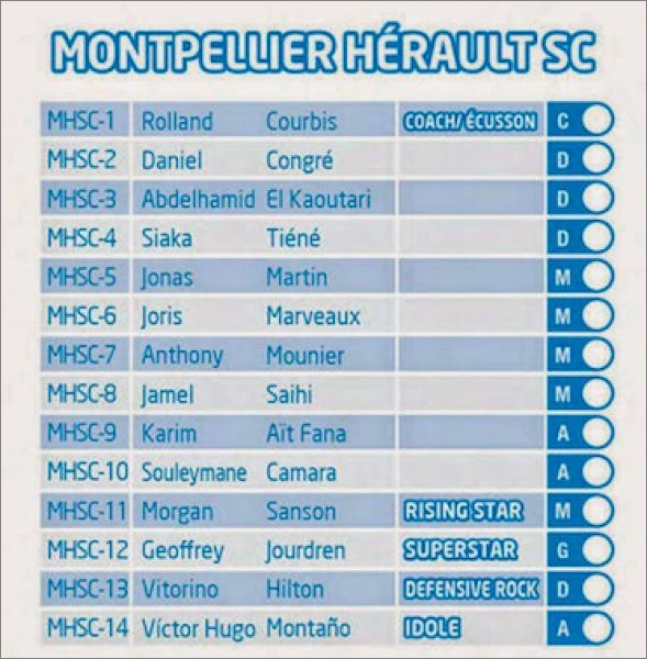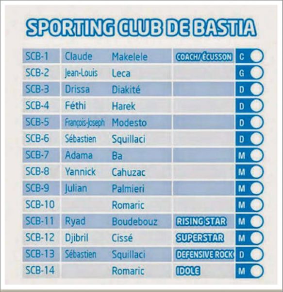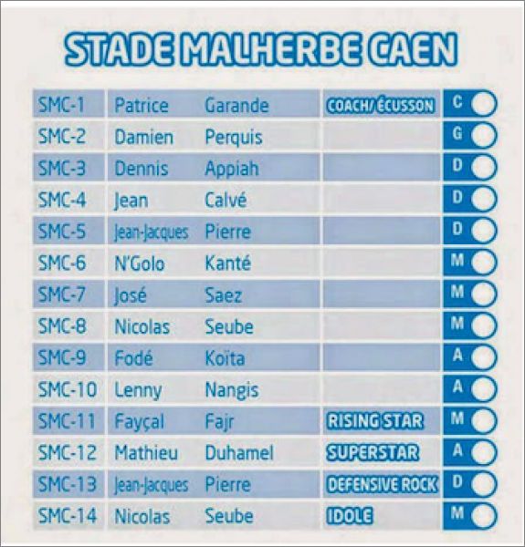 Panini : Asse1 à 14, Eag1 à 14, Etg1 à 14, Fcl1 à 14, Fcm1 à 14, Fcn1 à 14, Gdb1 à 14, Losc1 à 14, Mhsc1 à 14, Mon1 à 14, Ogcn1 à 14, Ol1 à 14,Om1 à 14, Psg1 à 14, Rcl1 à 14, Scb1 à 14, Sdr1 à 14, Smc1 à 14, Srfc1 à 14, Tfc1 à 14, Ch1 à Ch18, SCra1 et SCra2, IBR, FAL, KAL, MOU, LAC, LUI, AYE, VER, ASSE-UP1, ASSE-UP2, ASSE-UP3, EAG-UP1, ETG-UP1, ETG-UP2, FCL-UP1, . FCL-UP2, FCL-UP3, FCL-UP4, FCM-UP1, FCM-UP2, FCN-UP1, FCN-UP2, GDB-UP1, GDB-UP2, GDB-UP3, LOSC-UP1, LOSC-UP2, MHSC-UP1, MHSC-UP2, MHSC-UP3, MON-UP1, MON-UP2, MON-UP3, OGCN-UP1, OGCN-UP2, OGCN-UP3, OL-UP1, OL-UP2, OL-UP3, OM-UP1, OM-UP2, OM-UP3, PSG-UP1, PSG-UP2, PSG-UP3, RCL-UP1, SCB-UP1, SCB-UP2, SCB-UP3, SDR-UP1, SDR-UP2, SDR-UP3, SMC-UP1, SMC-UP2, SFRC-UP1, SFRC-UP2, SFRC-UP3, TFC-UP1, TFC-UP2, TFC-UP3, OM-CH-UP1, MON-CH-UP2