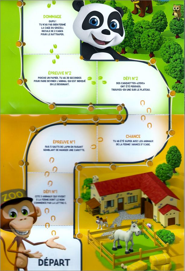 Au verso de ces 2 pages, il y a un jeu avec une case départ - des cases numérotées de 1 à 8 pour lesquelles il y a à chaque fois un défi, une épreuve et un case chance - une case arrivée.