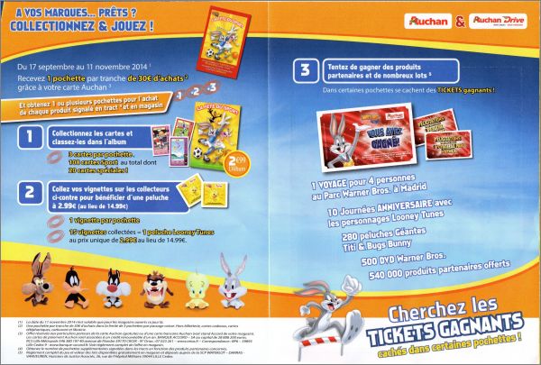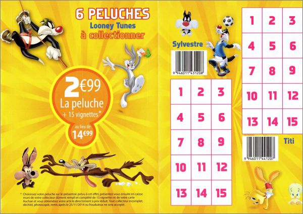 Dans chaque pochette une vignette qui vous permettra, dès 15 vignettes récoltées, de bénéficier d'une peluche à l'effigie de l'un de vos héros Looney Tunes préférés au prix unique de 2,99 au lieu de 14,99 (ils sont au nombre de 6).