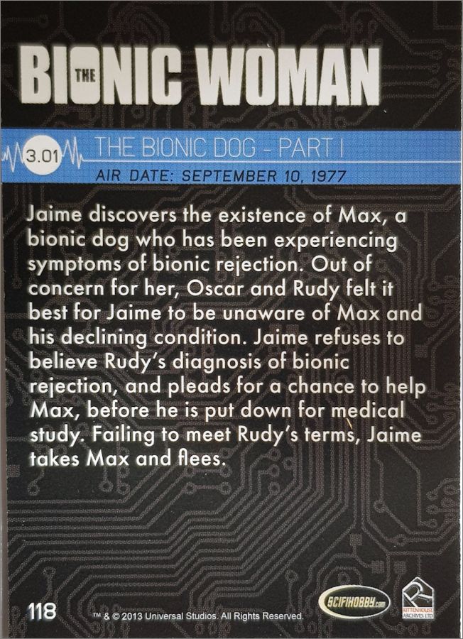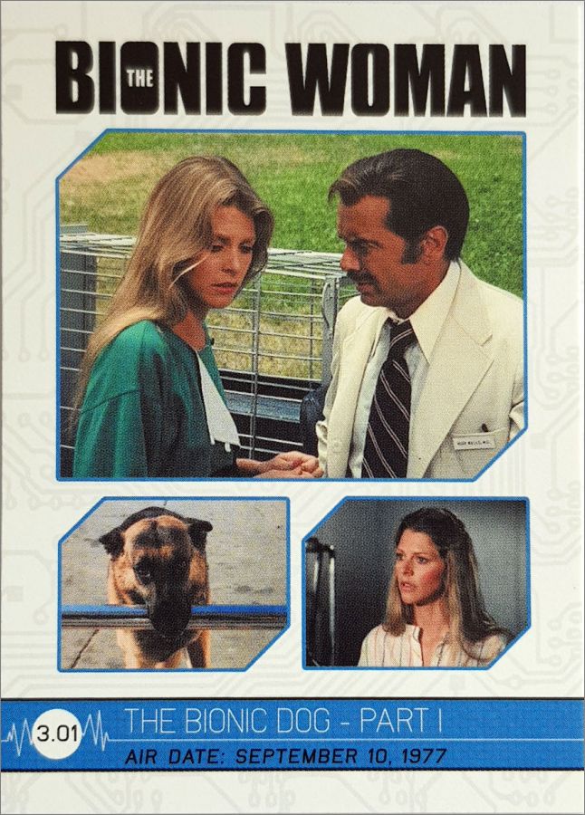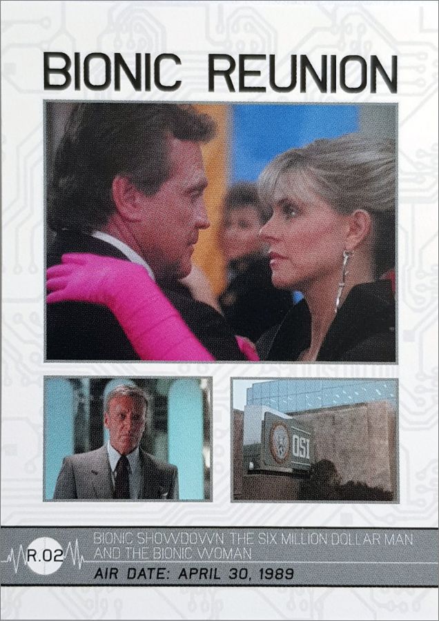 Il y a 3 codes couleurs, d'abord les 3 téléfilms de L'homme qui valait 3 milliards (cartes rouges), puis la série (rouge également) puis la série Super Jaimie (en bleu), et finalement les 3 téléfilms (en gris). Le dos décrit l'intégralité de l'épisode.