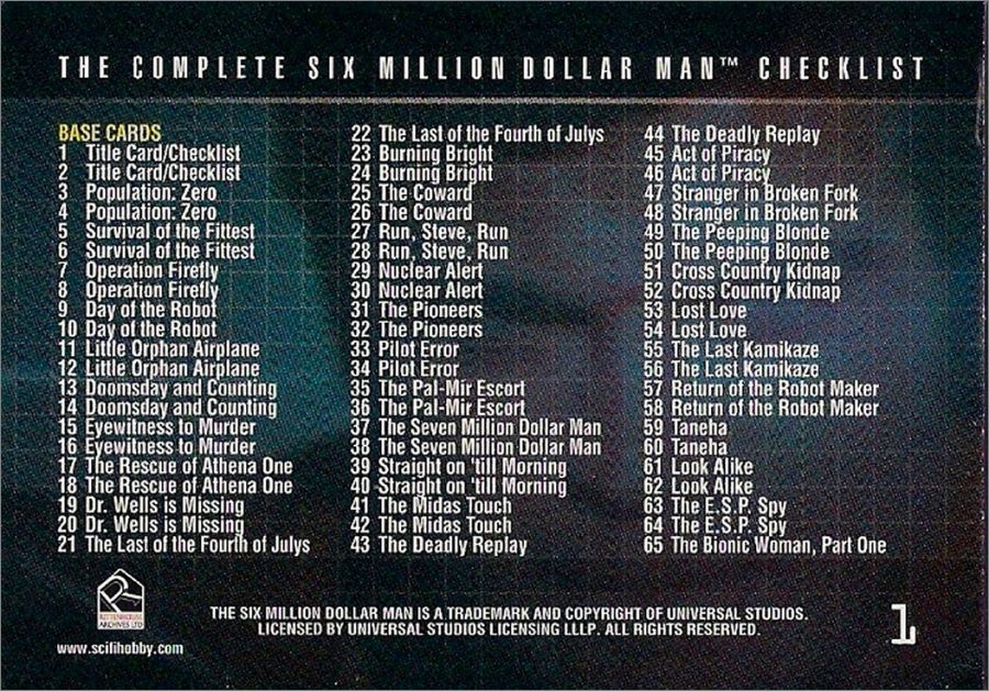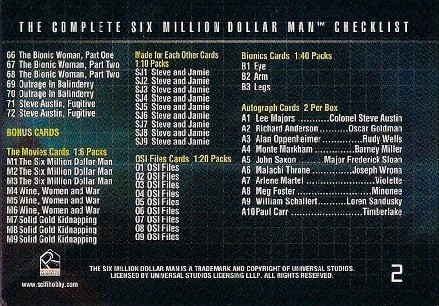 Base Cards : 1 à 72 The Movies Cards (1:6 Packs) : M1 à M9 Made For Each Other Cards (1:10 Packs) : SJ1 à SJ9 OSI Files Cards (1:20 Packs) : OSI1 à OSI9 Bionics Cards (1:40 Packs) : B1 à B3 Autographs Cards 2 Per Box : A1 à A10 Promo Cards : P1 à P2