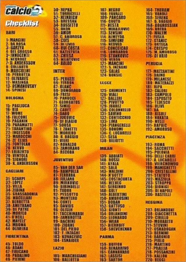 DS : 1 à 331 + 15 cards Gli Azzurri non numérotées + 15 cards Giovani Leoni non numérotées (voir le détail dans la fiche) + carte Checklist
