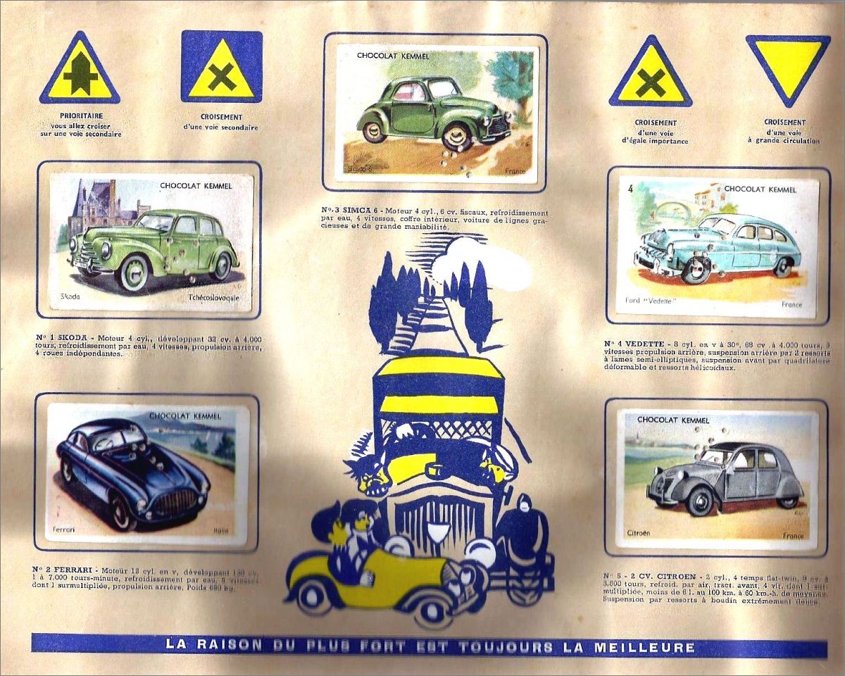 Album de voitures de marques françaises et étrangères qui permettait en même temps de s'instruire au code de la route et d'apprendre les signaux routiers et internationaux.