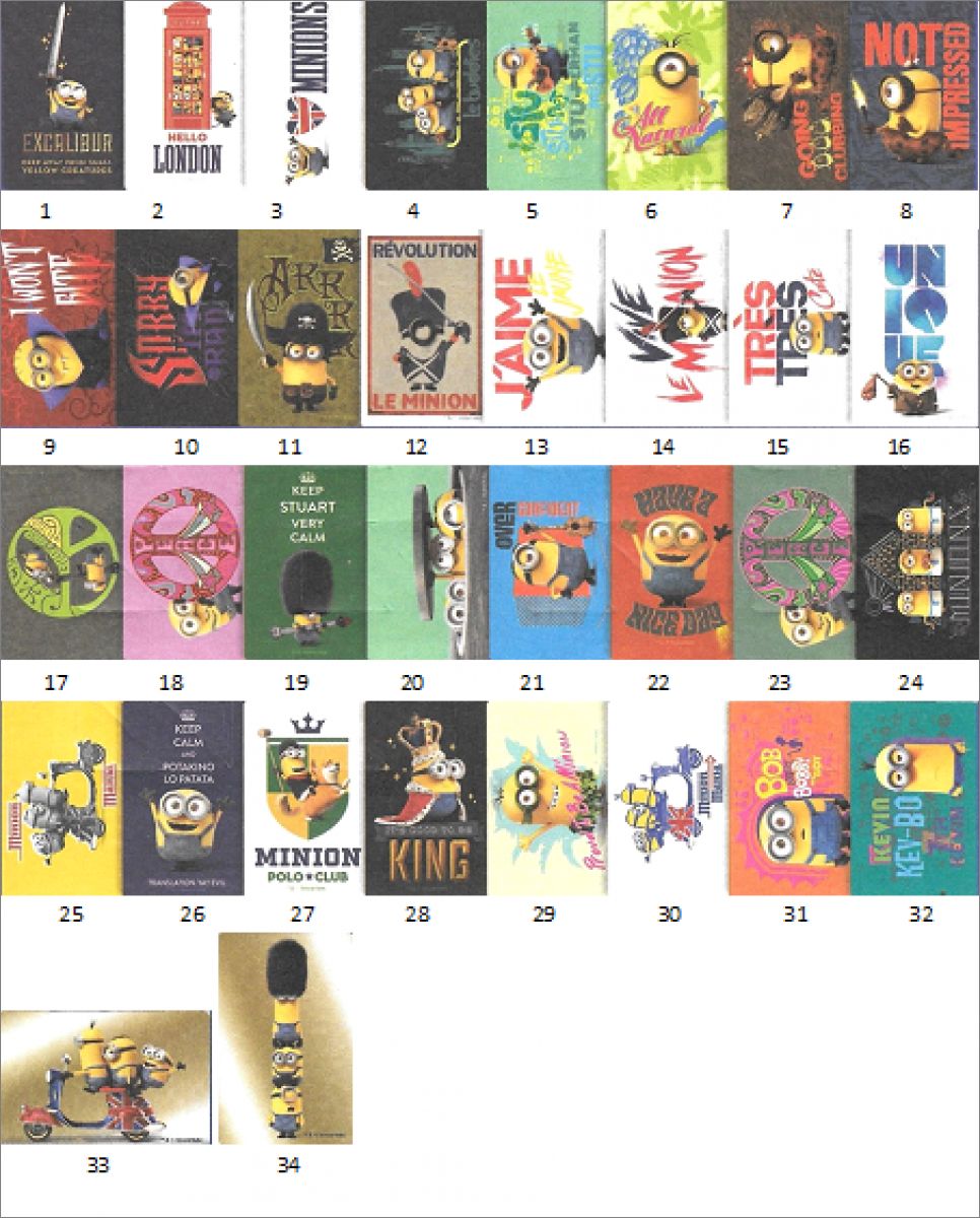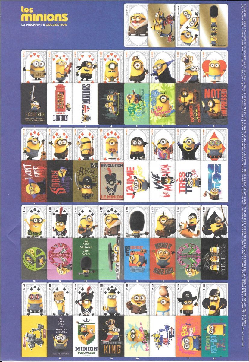 La collection se compose de 34 cartes (séparées en cinq catégories une fois l'autocollant retiré) :