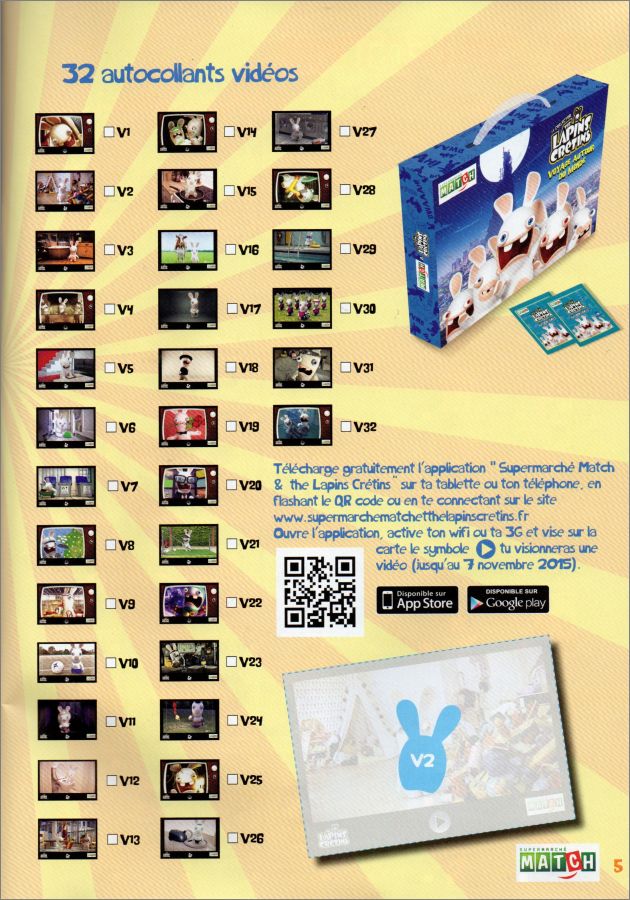 32 autocollants "vidéo" (au dos des images il y a des QRcode pour voir les vidéos jusqu'au 7 novembre 2015) numérotés V1 à V32. Ce sont ceux entourés de noir.