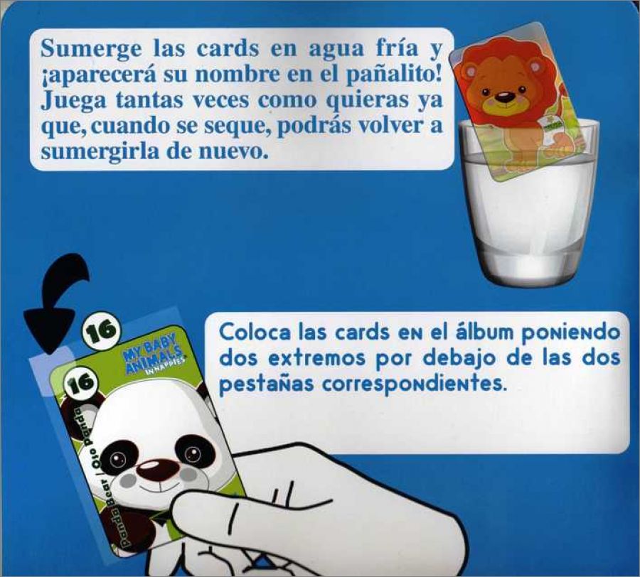 - l'autre côté avec le petit animal (avec certaines parties du corps en peluche toute fine) dont on voit le nom si on le plonge dans l'eau. Dès que ça sèche, on peut recommencer... (voir le mode d'emploi dans la fiche)