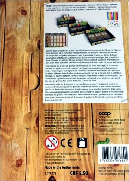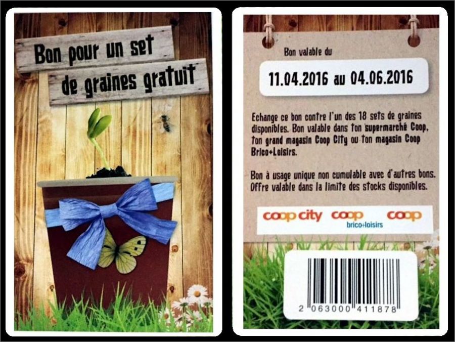 Les sets de graines sont remis contre un bon ou proposés à la vente au prix de CHF 0.90 dans les supermarchés Coop, les Coop City et les Coop Brico+Loisirs. Les bons se trouvent dans les pochettes de cartes à collectionner. Il y a en tout 18 sets de graines qui permettent de semer des herbes aromatiques, des légumes et des fleurs.