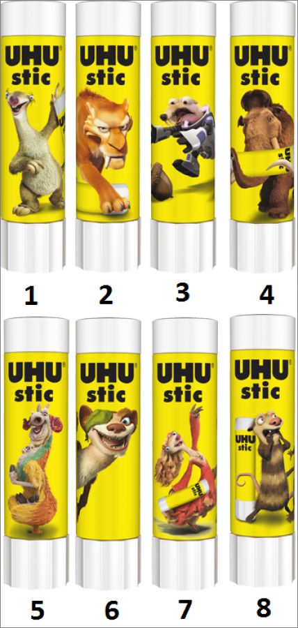 Collection de 8 étiquettes qui entourent les stic de colle UHU.
