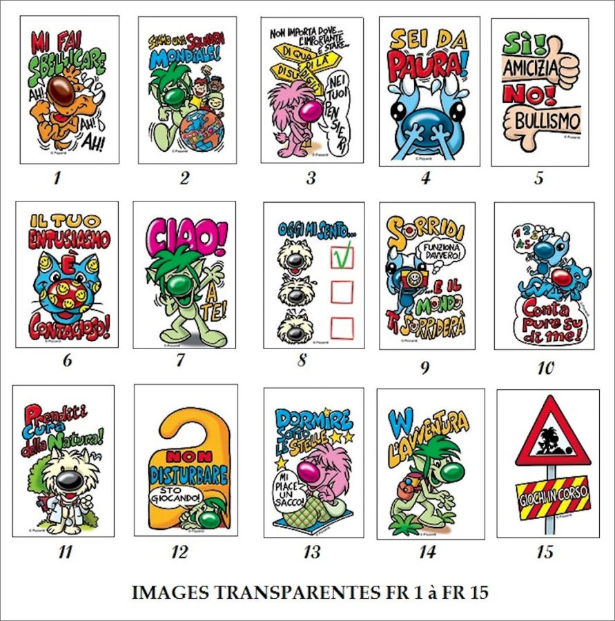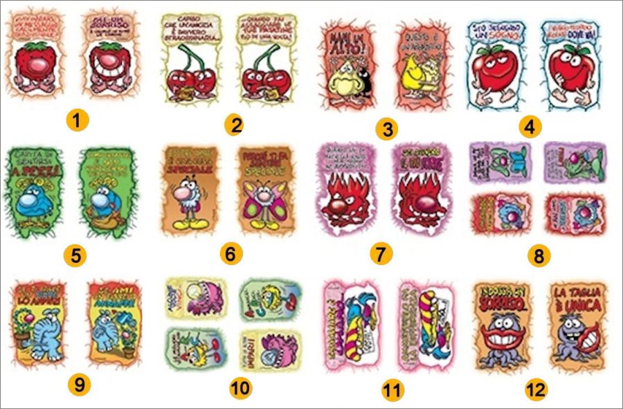 Pizzardi : de 401 à 625, FR1 à FR15, LN1 à LN8, Dop1 à Dop12 (Images Doppiolotti), C1 à C72 (Cartes), T1 à T16 (tattoos)
