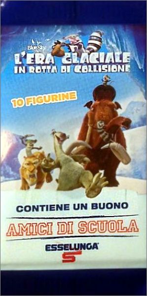 Collezione dei supermercati Esselunga. Presentando la Carta Fìdaty, otterrete alla cassa 1 bustina con 10 figurine adesive de “L'era glaciale – In rotta di collisione” e 1 Buono Amici di Scuola ogni 25 euro di spesa (scontrino unico) o ogni 50 Punti Fragola (scontrino unico) con l'acquisto dei prodotti evidenziati sugli scaffali.