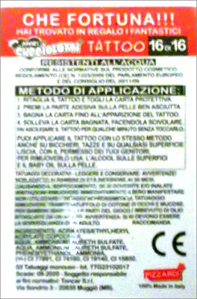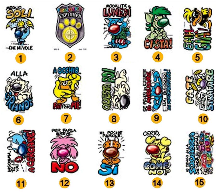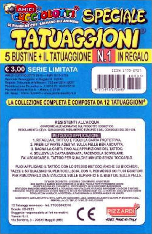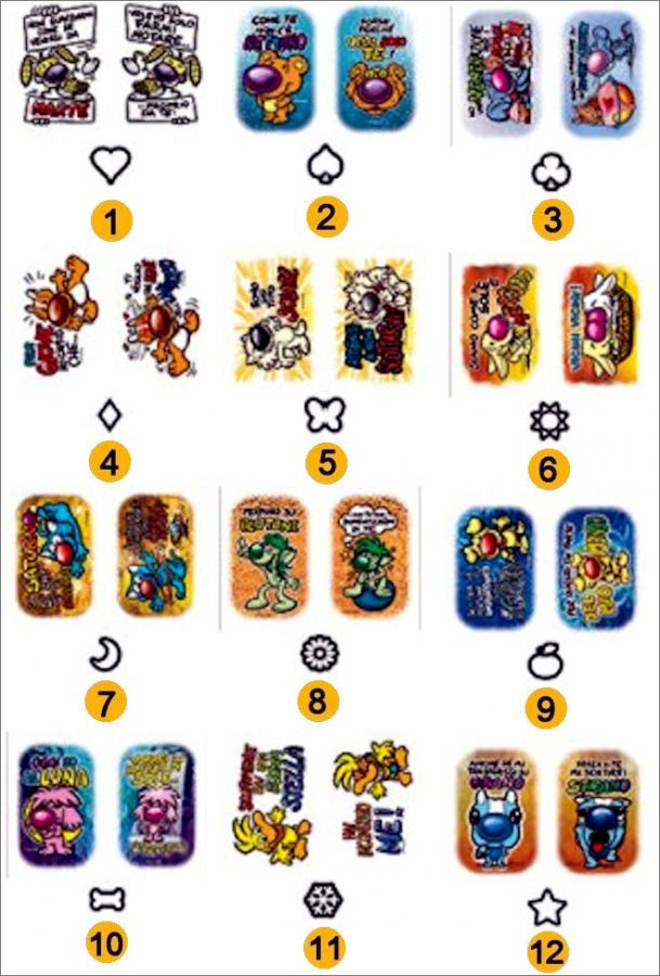 Pizzardi : de 401 à 625, D1 à D12, P1 à P72, FR1 à FR15, LN1 à LN8, Tat1 à Tat16 (Tat = Tattoo), FS, FE1 à FE12, TT1 à TT12 (Tattoo spéciaux)