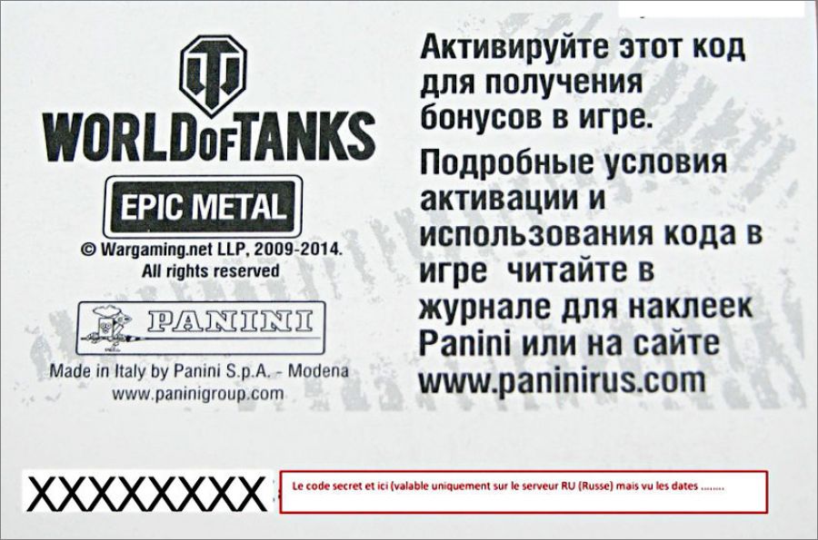 Dans certains packs on trouve une petite carte avec un code bonus (activable uniquement sur le Serveur RU du jeu,qui donne droit à des bonus dans le jeu).Texte dans l'album: Anglais.