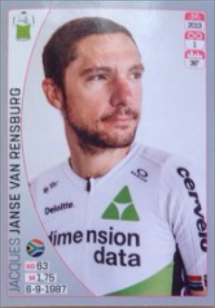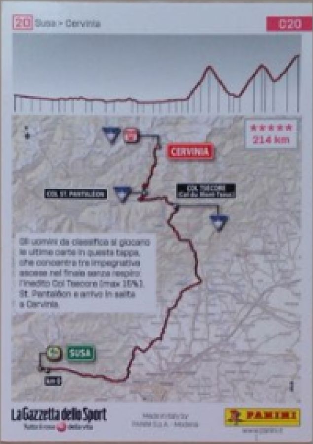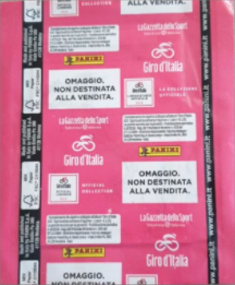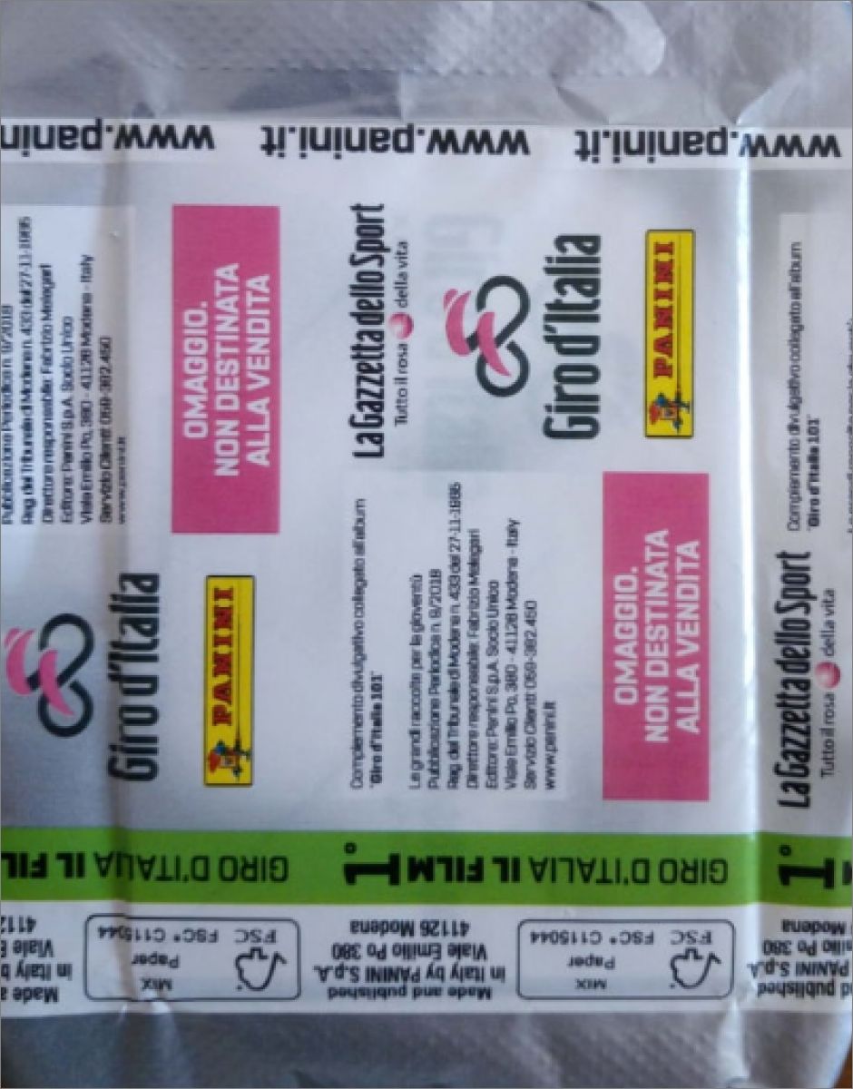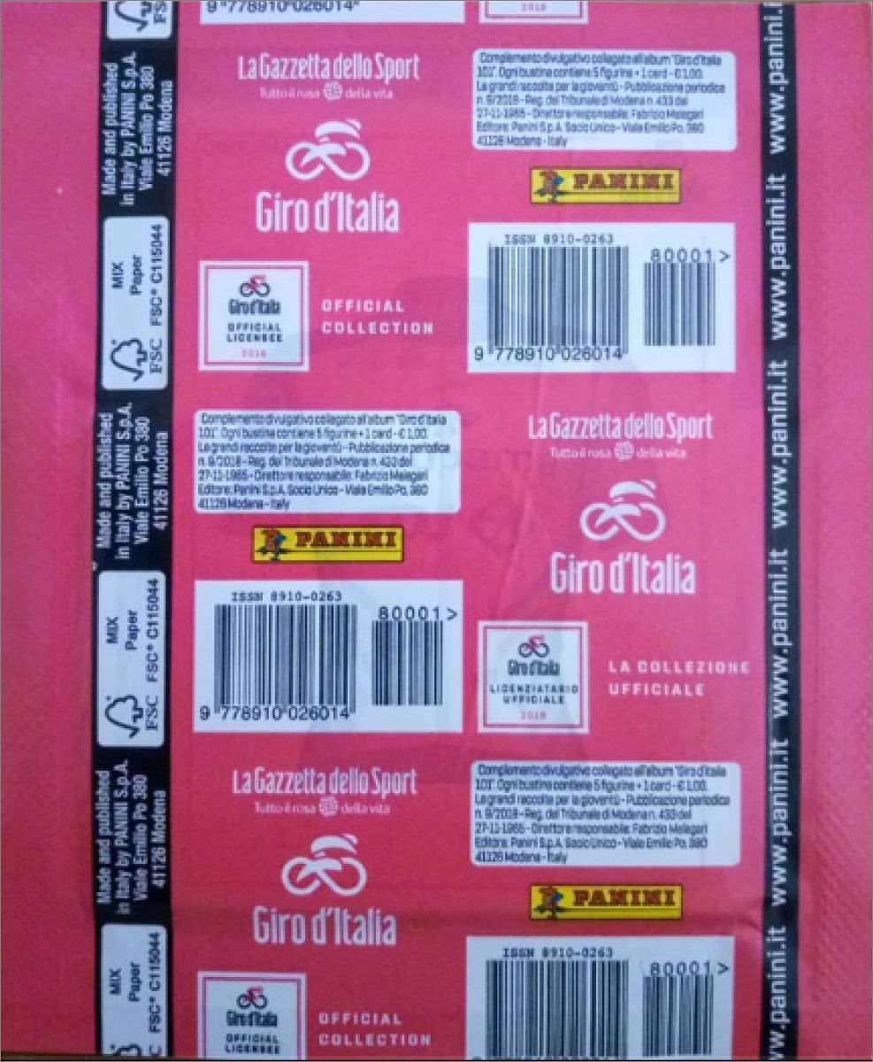 La pochette comporte 5 images + 1 carte au prix de 1€ (Pochette de 5 stickers et 1 carte de la Collection officielle Panini de stickers GIRO D'ITALIA.101