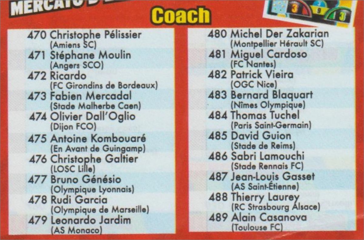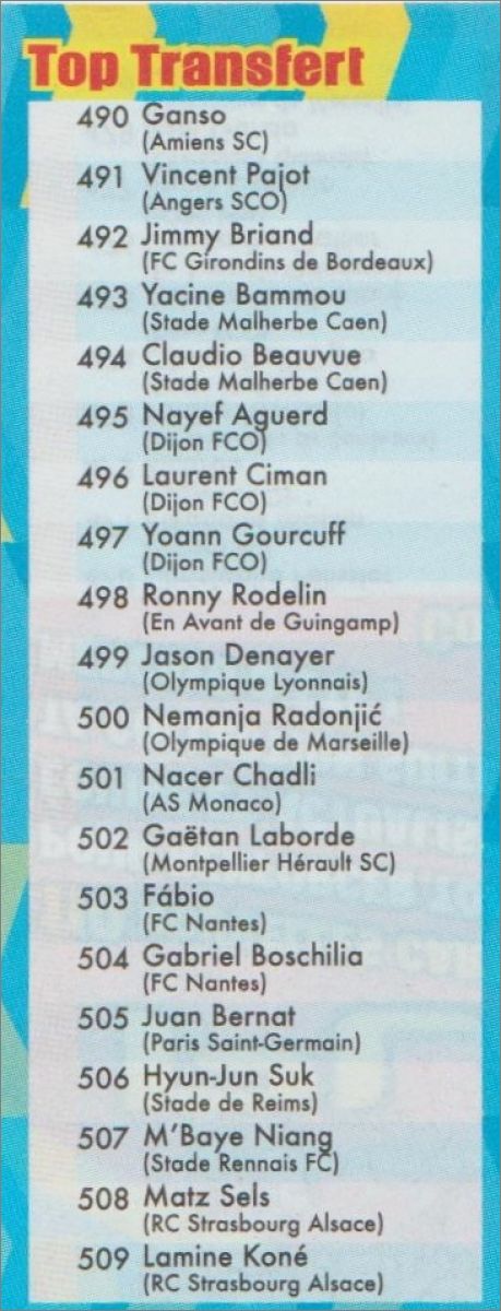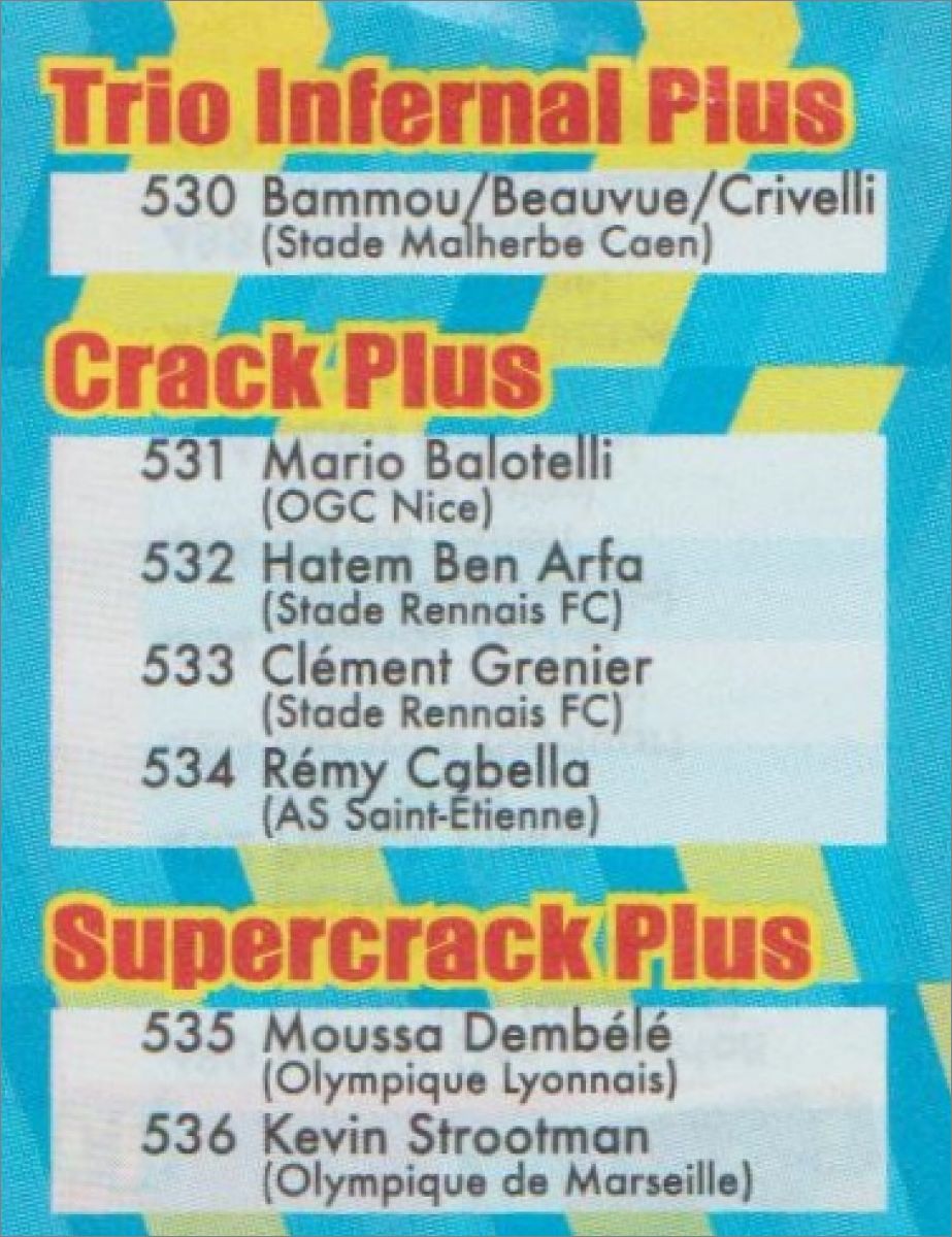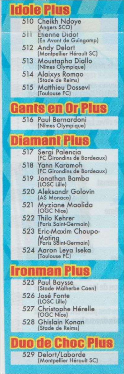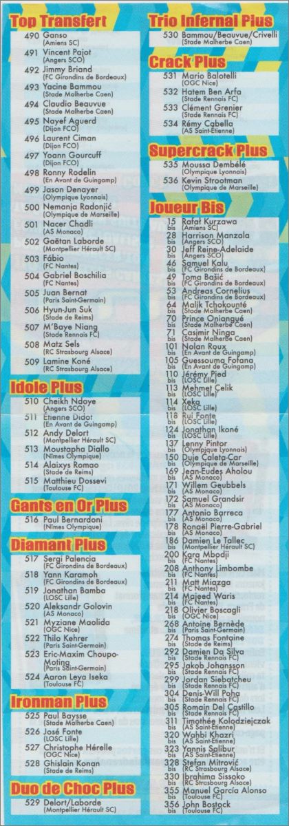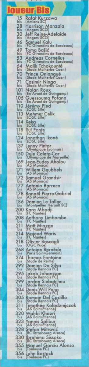 Panini : 361 à 536, Ber, Buf, Deb, Dia, Di-M, Dra, Dub, Fek, Ghe, Jal, Lov, Mar, Mit, Pay, Rem, Rey, Ruf, Sak, Sal, San, Str, Tra, A, B, C, Or, 15-bis, 28-bis, 30-bis, 46-bis, 49-bis, 53-bis, 64-bis, 70-bis, 71-bis, 101-bis, 105-bis, 110-bis, 113-bis, 114-bis, 118-bis, 124-bis, 137-bis, 150-bis, 169-bis, 171-bis, 172-bis, 177-bis, 178-bis, 186-bis, 200-bis, 208-bis, 211-bis, 214-bis, 218-bis, 268-bis, 274-bis, 292-bis, 295-bis, 299-bis, 304-bis, 305-bis, 311-bis, 320-bis, 323-bis, 328-bis, 330-bis, 355-bis, 356-bis