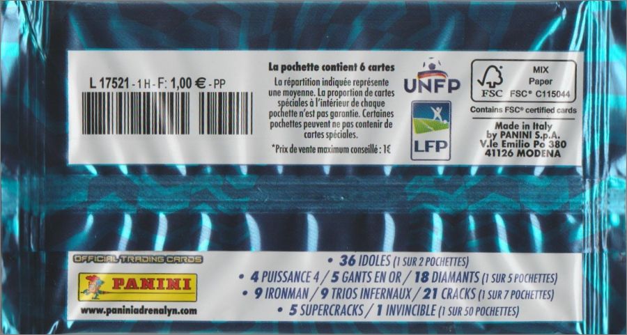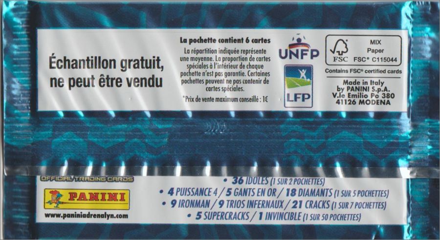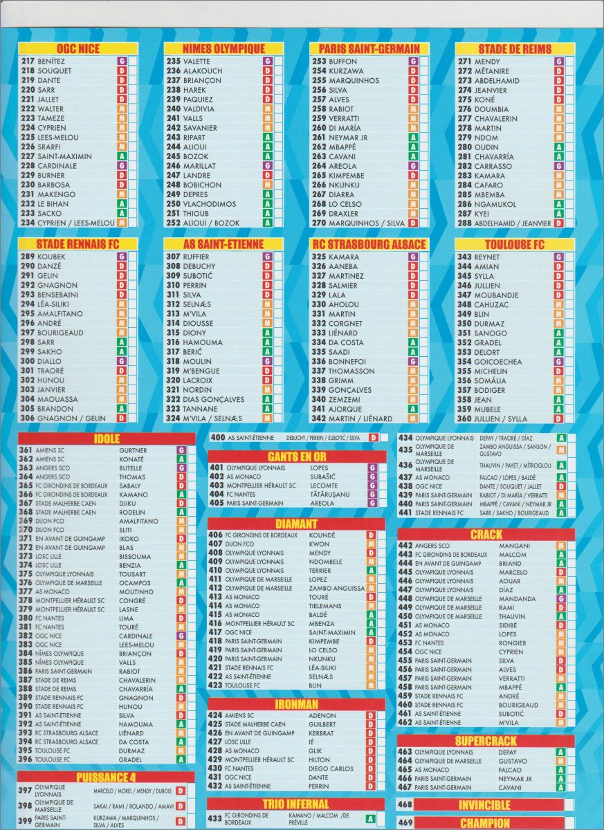 Pack démarrage (8 €) : 1 classeur de 60 feuilles numéroté (1 à 540) + 4 pochettes de 6 cartes + terrain de jeu + guide officiel + check-list de poche + 2 cartes en ÉDITION LIMITÉE (8 euros) : SANSON (OM) ET MARQUINHOS (PSG)