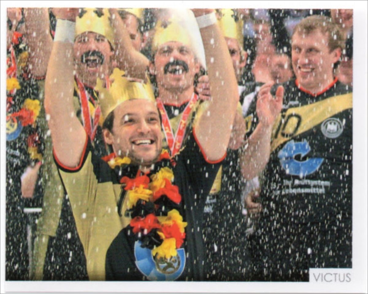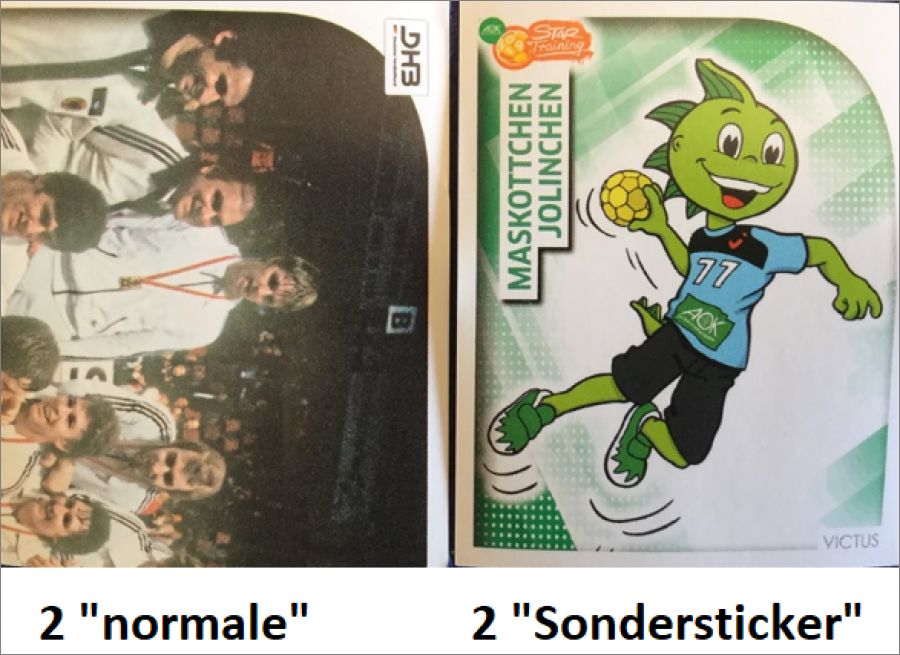il y a de nombreux stickers particuliers comme, par exemple, le champion du monde de football Lukas Podolski (voir scan) qui fait de la publicité comme ambassadeur du sport et du handball.