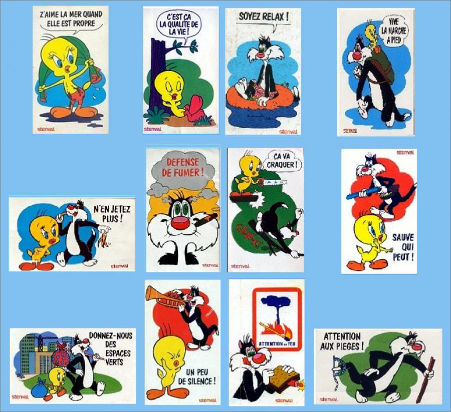 Titi et la qualité de la vie - Desserts Boom Stenval - 1975 20 images (numérotées) offertes avec les desserts "BOOM" dont certaines images semblent identiques (mais pas même dimensions, plus carées (93 x 110 mm)