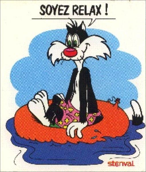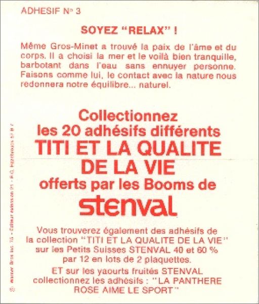 Titi et la qualité de la vie - Petits suisses Stenval - 1975 12 images (numérotées) offertes avec les desserts "Petits suisses" dont certaines images semblent identiques (mais pas même dimensions, plus étirées (60 x 100 mm)