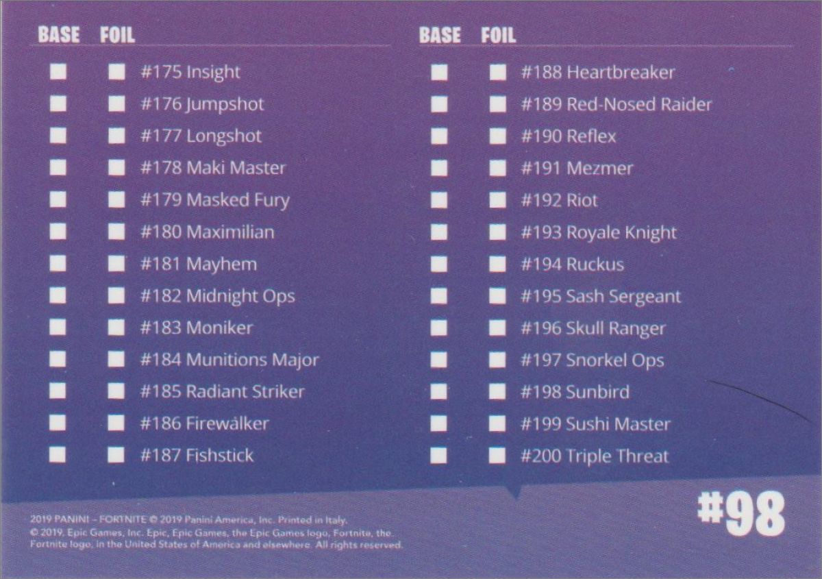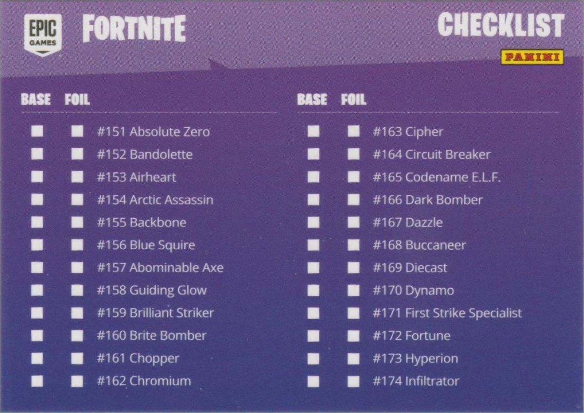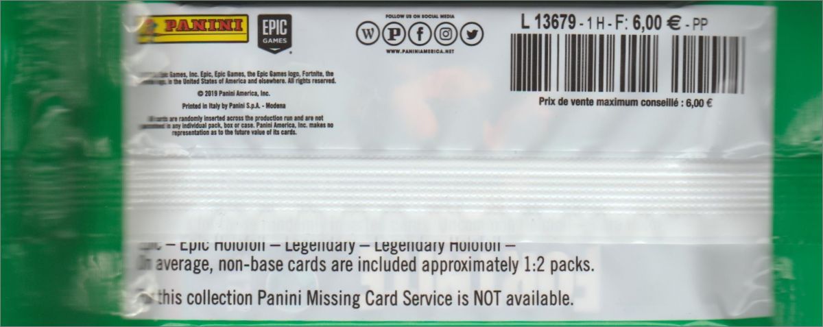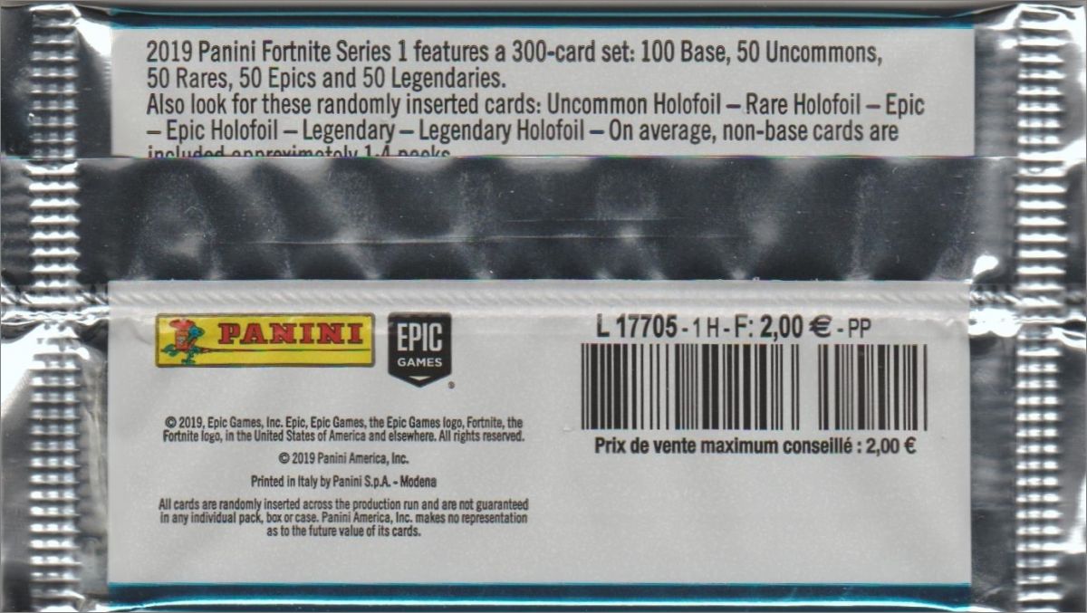 Fortnite : Epic games séries 1 Trading (part 3) Panini 2019Dans la partie 1 (la base) = cartes classiques non brillantesParu en France en Juin 2019