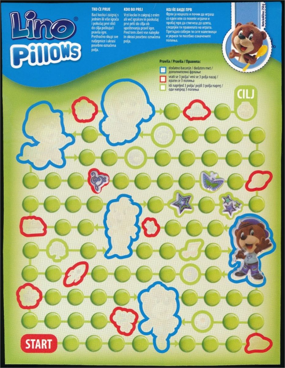 L'album est fait avec un côté de la boîte du produit, vous devez le découper de la boîte. Il est en édition limitée de la célèbre marque de produits alimentaires Podravka LINO l'ours. Dans chaque boîte, vous obtenez 1 autocollant. Boîte coûte environ 2,5 euros.