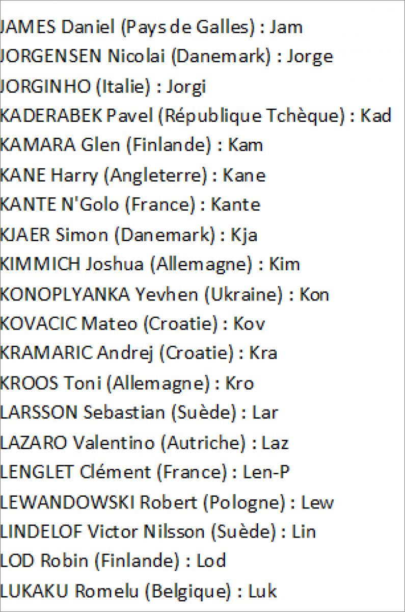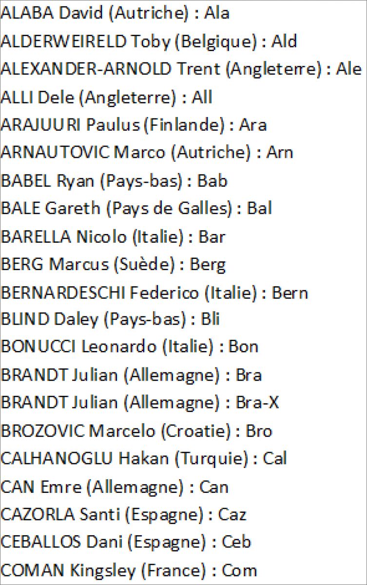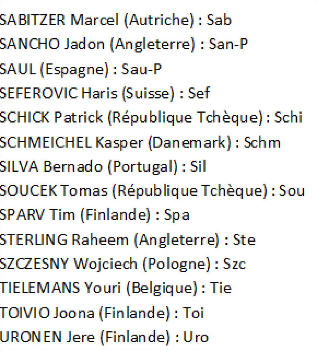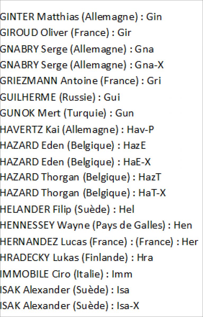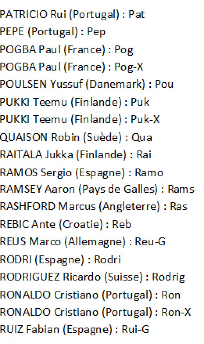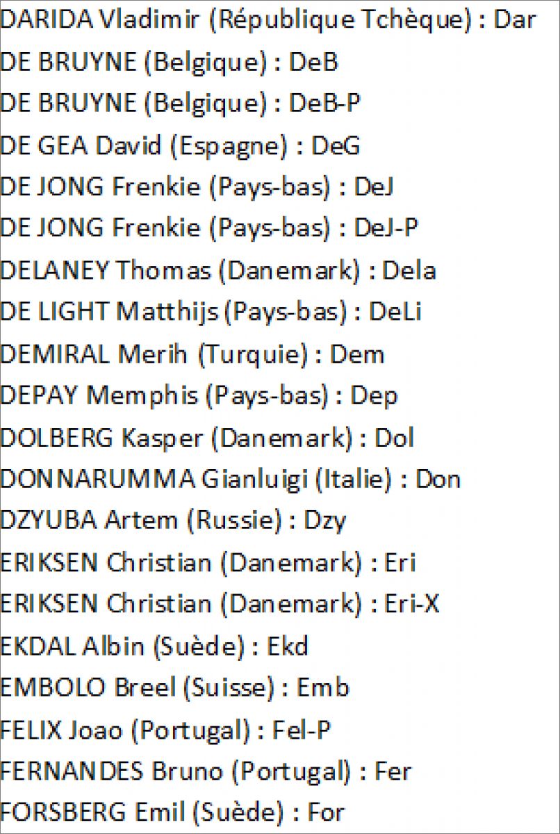 Cartes "édition limitée" *lim : Ala, Ald, Ale, All, Ara, Arn, Bab, Bal, Bar, Berg, Bern, Bli, Bon, Bra, Bro, Cal, Can, Caz, Ceb, Com, Cou, Dar, DeB, DeG, DeJ, Dela, Deli, Dem, Dep, Dol, Don, Dzy, Eri, Ekd, Emb, Fer, For, Gin, Gir, Gna, Gri, Gui, HazE, HarT, Hel, Hen, Her, Hra, Imm, Isa, Jam, Jorge, Jorgi, Kad, Kam, Kane, Kante, Kja, Kim, Kon, Kov, Kra, Kro, Kry, Lar, Laz, Lew, Lin, Lod, Luk, Mag, Mba, Mer, Mil, MirAl, MirAn, Mod, Mora, More, Mou, Neu, Nev, Olse, Olss, Pat, Pep, Pic, Pog, Pou, Puk, Qua, Rai, Ramo, Rams, Ras, Reb, Rodri, Rodrig, Ron, Sab, Sef, Schi, Schm, Sil, Sou, Spa, Ste, Sul, Szc, Tie, Toi, Uro, Vai, VanDe, VanDi, Var, Vid, Wij, Xha, Yare, Yarm, Yil, Zie, Zin